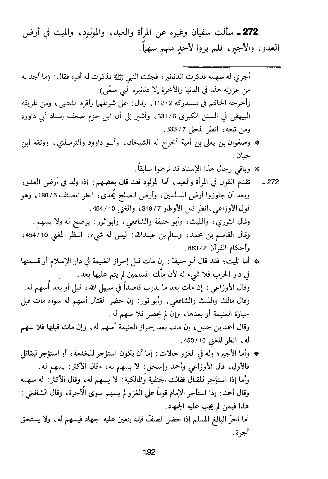 272 - سَأَلْتُ سُفْيَانَ وَغَيْرَهُ عَنِ الْمَرْأَةِ وَالْعَبْدِ وَالْمَوْلُودِ وَالْمَيِّتِ فِي أَرْضِ الْعَدُوِّ وَالْأَجِيرِ، فَلَمْ يَرَوْا لِأَحَدٍ مِنْهُمْ سَهْمًا، وَلَا لِلصَّبِيِّ الَّذِي لَمْ يَحْتَلِمْ يُغْزَا بِهِ، إِلَّا أَنْ يُقَاتِلَ فَيُرْضَخَ لَهُ، وَلَمْ يَرَ سُفْيَانُ لِلْمَيِّتِ سَهْمًا، وَإِنْ قَطَعَ الدَّرْبَ إِلَّا أَنْ يَكُونَ أَصَابَ الْغَنِيمَةَ ثُمَّ مَاتَ.