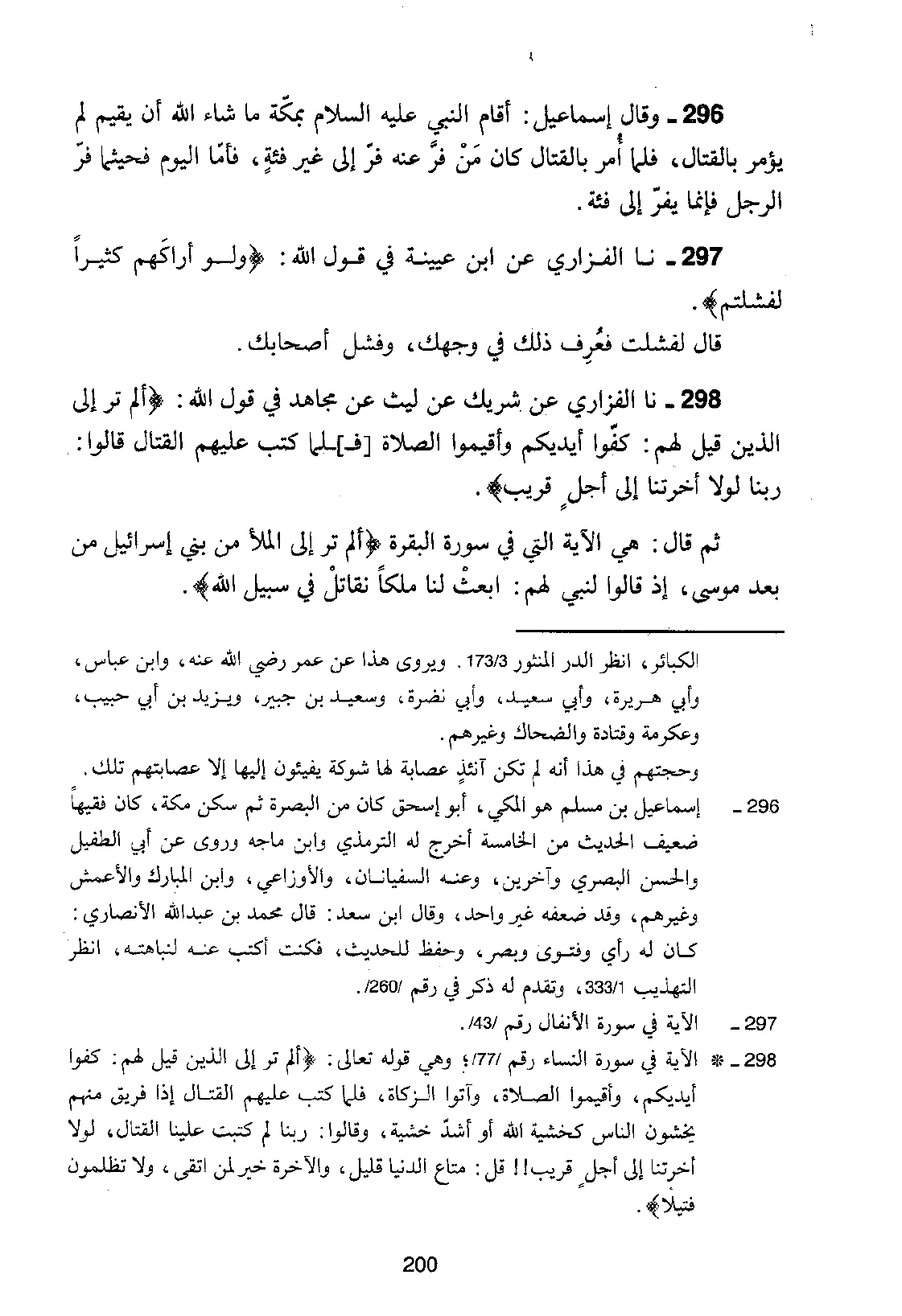 298 - نا الْفَزَارِيُّ، عَنْ شَرِيكٍ، عَنْ لَيْثٍ، عَنْ مُجَاهِدٍ، فِي قَوْلِ اللَّهِ: {§أَلَمْ تَرَ إِلَى الَّذِينَ قِيلَ لَهُمْ كُفُّوا أَيْدِيَكُمْ وَأَقِيمُوا الصَّلَاةَ وَآتُوا الزَّكَاةَ فَلَمَّا كُتِبَ عَلَيْهِمُ الْقِتَالُ إِذَا فَرِيقٌ مِنْهُمْ يَخْشَوْنَ النَّاسَ كَخَشْيَةِ اللَّهِ أَوْ أَشَدَّ خَشْيَةً وَقَالُوا رَبَّنَا لِمَ كَتَبْتَ عَلَيْنَا الْقِتَالَ لَوْلَا أَخَّرْتَنَا إِلَى أَجَلٍ قَرِيبٍ} [النساء: 77] ، ثُمَّ قَالَ: هِيَ الْآيَةُ الَّتِي فِي سُورَةِ الْبَقَرَةِ {أَلَمْ تَرَ إِلَى الْمَلَأِ مِنْ بَنِي إِسْرَائِيلَ مِنْ بَعْدِ مُوسَى إِذْ قَالُوا لِنَبِيٍّ لَهُمُ ابْعَثْ لَنَا مَلِكًا نُقَاتِلْ فِي سَبِيلِ اللَّهِ} -[201]- قَالَ: ثُمَّ قَرَأَ إِلَى قَوْلِهِ: {فَلَمَّا كُتِبَ عَلَيْهِمُ الْقِتَالُ تَوَلَّوْا إِلَّا قَلِيلًا مِنْهُمْ وَاللَّهُ عَلِيمٌ بِالظَّالِمِينَ} [البقرة: 246]