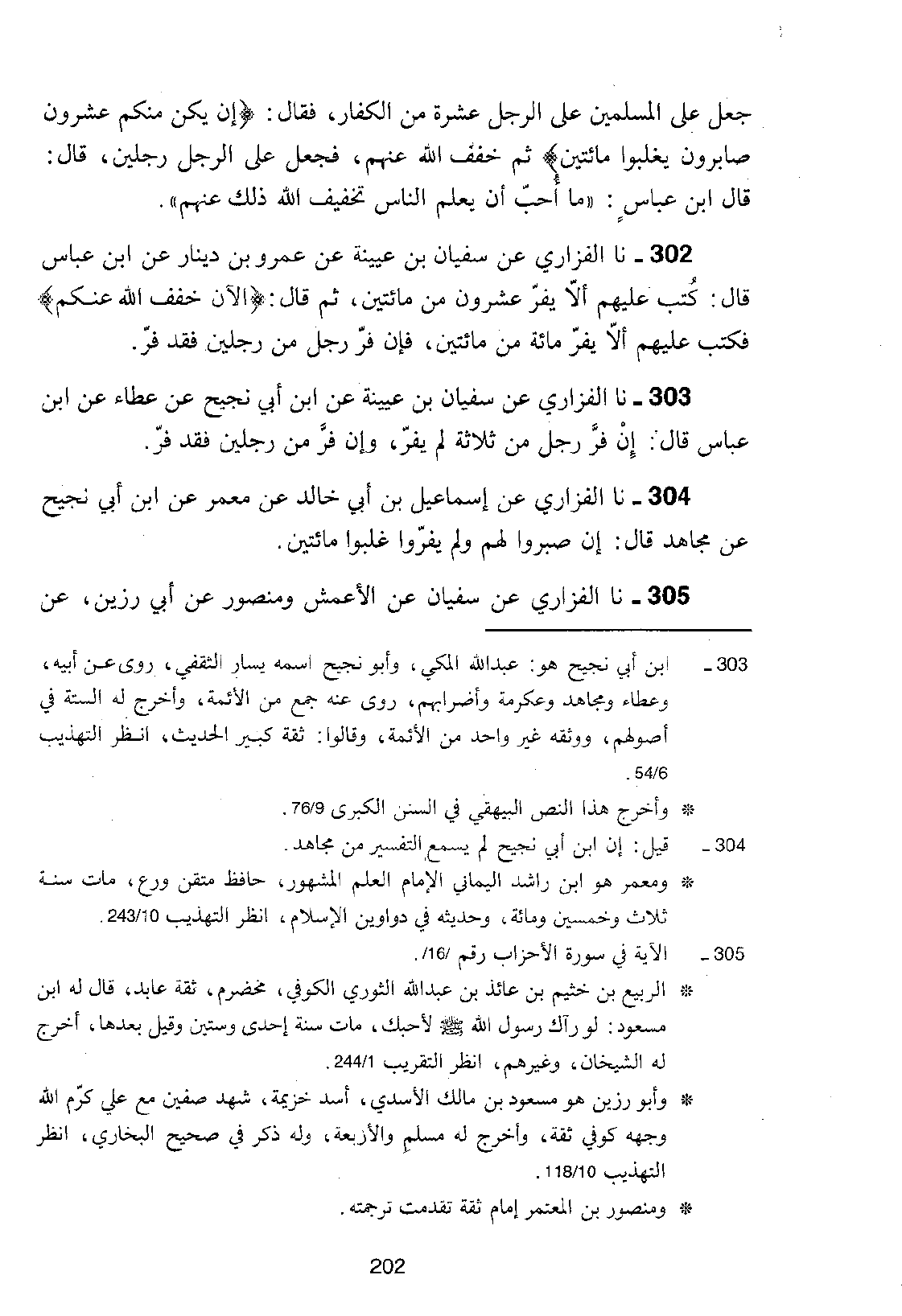 302 - نا الْفَزَارِيُّ، عَنْ سُفْيَانَ بْنِ عُيَيْنَةَ، عَنْ عَمْرِو بْنِ دِينَارٍ، عَنِ ابْنِ عَبَّاسٍ، قَالَ: §كُتِبَ عَلَيْهِمْ أَلَّا يَفِرَّ عِشْرُونَ مِنْ مِائَتَيْنِ، ثُمَّ قَالَ: {الْآنَ خَفَّفَ اللَّهُ عَنْكُمْ} [الأنفال: 66] فَكَتَبَ عَلَيْهِمْ أَلَّا يَفِرَّ مِائَةٌ مِنْ مِائَتَيْنِ، فَإِنْ فَرَّ رَجُلٌ مِنْ رَجُلَيْنِ فَقَدْ فَرَّ "