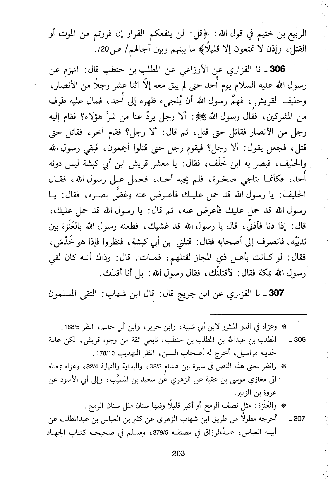306 - نا الْفَزَارِيُّ، عَنِ الْأَوْزَاعِيِّ، عَنِ الْمُطَّلِبِ بْنِ حَنْطَبٍ، قَالَ: انْهَزَمَ عَنْ رَسُولِ اللَّهُ عَلَيْهِ السَّلَامُ يَوْمَ أُحُدٍ حَتَّى لَمْ يَبْقَ مَعَهُ إِلَّا اثْنَا عَشَرَ رَجُلًا مِنَ الْأَنْصَارِ، وَحَلِيفٌ لِقُرَيْشٍ، فَهَمَّ رَسُولُ اللَّهِ أَنْ يُلْجِئَ ظَهْرَهُ إِلَى أُحُدٍ فَمَالَ عَلَيْهِ طَرَفٌ مِنَ الْمُشْرِكِينَ، فَقَالَ رَسُولُ اللَّهِ صَلَّى اللهُ عَلَيْهِ وَسَلَّمَ: «§أَلَا رَجُلٌ يَرُدُّ عَنَّا مِنْ شَرِّ هَؤُلَاءِ؟» فَقَامَ إِلَيْهِ رَجُلٌ مِنَ الْأَنْصَارِ فَقَاتَلَ حَتَّى قُتِلَ، ثُمَّ قَالَ: «أَلَا رَجُلٌ؟» فَقَامَ آخَرُ، فَقَاتَلَ حَتَّى قُتِلَ، فَجَعَلَ يَقُولُ: «أَلَا رَجُلٌ؟» فَيَقُومُ رَجُلٌ حَتَّى قُتِلُوا أَجْمَعُونَ، فَبَقِيَ رَسُولُ اللَّهِ وَالْحَلِيفُ، فَبَصُرَ بِهِ ابْنُ خَلَفٍ، فَقَالَ: يَا مَعْشَرَ قُرَيْشٍ ابْنُ أَبِي كَبْشَةَ لَيْسَ دُونَهُ أَحَدٌ، فَكَأَنَّمَا يُنَاجِي صَخْرَةً، فَلَمْ يُجِبْهُ أَحَدٌ، فَحَمَلَ عَلَى رَسُولِ اللَّهِ، فَقَالَ الْحَلِيفُ: يَا رَسُولَ اللَّهِ قَدْ حَمَلَ عَلَيْكَ فَأَعْرَضَ عَنْهُ وَغَضَّ بَصَرَهُ فَقَالَ: يَا رَسُولَ اللَّهِ قَدْ حَمَلَ عَلَيْكَ فَأَعْرَضَ عَنْهُ، ثُمَّ قَالَ: يَا رَسُولَ اللَّهِ قَدْ حَمَلَ عَلَيْكَ قَالَ: إِذَا دَنَا فَآذِنِّي قَالَ: يَا رَسُولَ اللَّهِ قَدْ غَشِيَكَ فَطَعَنَهُ رَسُولُ اللَّهِ بِالْعَنَزَةَ بَيْنَ ثَدْيَيْهِ، فَانْصَرَفَ إِلَى أَصْحَابِهِ فَقَالَ: قَتَلَنِي ابْنُ أَبِي كَبْشَةَ، فَنَظَرُوا فَإِذَا هُوَ خَدْشٌ، فَقَالَ: لَوْ كَانَتْ بِأَهْلِ ذِي الْمَجَازِ لَقَتَلَهُمْ فَمَاتَ قَالَ: وَذَاكَ أَنَّهُ كَانَ لَقِيَ رَسُولَ اللَّهِ بِمَكَّةَ فَقَالَ: لَأَقْتُلَنَّكَ، فَقَالَ رَسُولُ اللَّهِ: «بَلْ أَنَا أَقْتُلُكَ»