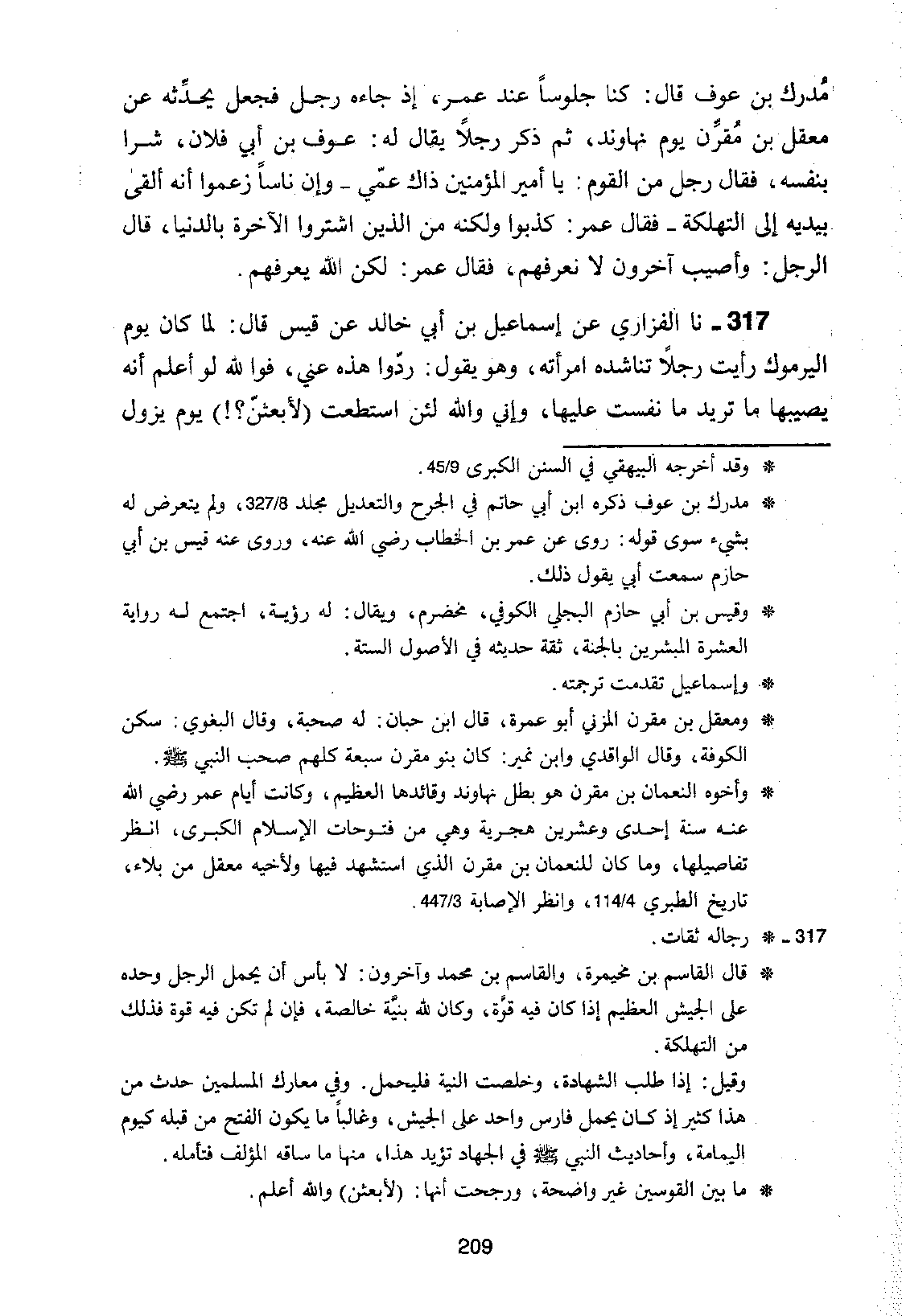 317 - نا الْفَزَارِيُّ، عَنْ إِسْمَاعِيلَ بْنِ أَبِي خَالِدٍ، عَنْ قَيْسٍ، قَالَ: " §لَمَّا كَانَ يَوْمُ الْيَرْمُوكِ رَأَيْتُ رَجُلًا تُنَاشِدُهُ امْرَأَتُهُ، وَهُوَ يَقُولُ: رُدُّوا هَذِهِ عَنِّي، فَوَاللَّهِ لَوْ أَعْلَمُ أَنَّهُ يُصِيبُهَا مَا تُرِيدُ مَا نَفِسْتُ عَلَيْهَا، وَإِنِّي لَئِنِ اسْتَطَعْتُ لَأُبْعَثَنَّ يَوْمَ يَزُولُ -[210]- هَذَا الْجَبَلُ عَنْ مَكَانِهِ، فَإِنْ غُلِبْتُمْ عَلَى جَسَدِي فَادْفِنُونِي، فَرَجَعْتُ إِلَيْهِ فَوَجَدْتُهُ قَدْ دُفِنَ "