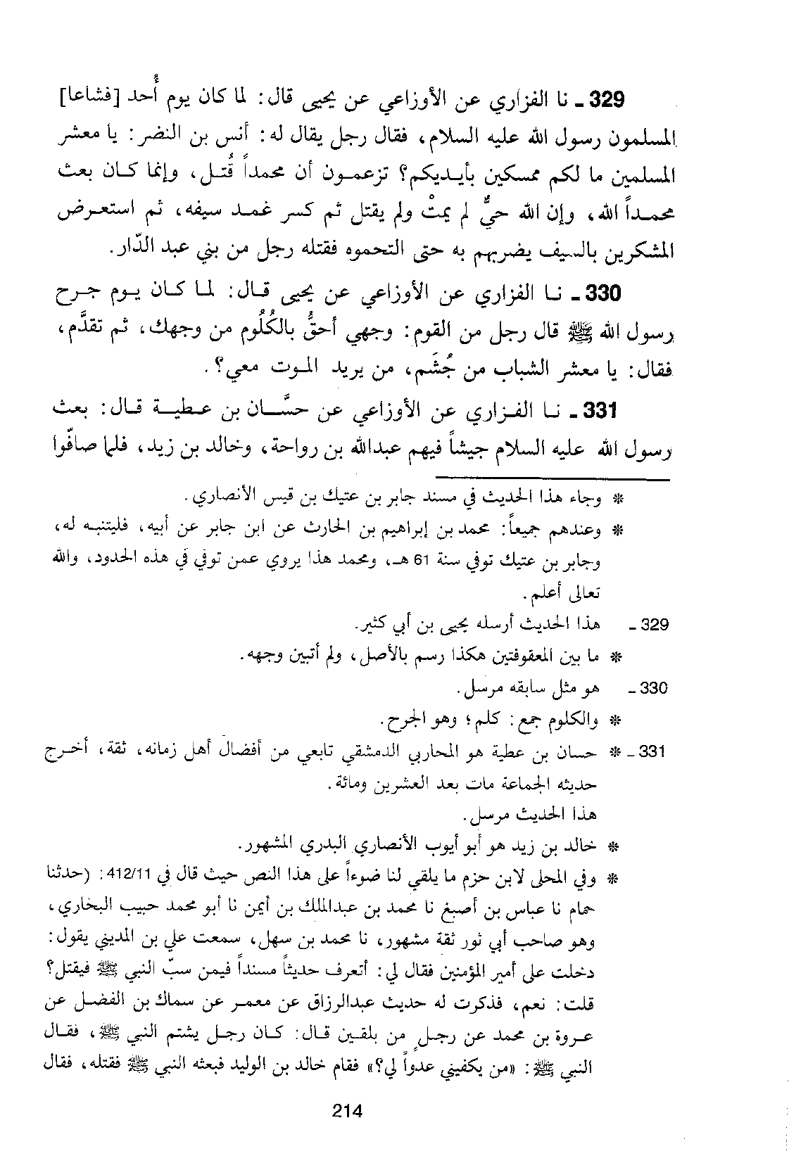 329 - نا الْفَزَارِيُّ، عَنِ الْأَوْزَاعِيِّ، عَنْ يَحْيَى، قَالَ: لَمَّا كَانَ يَوْمُ أُحُدٍ فَشَاعَ الْمُسْلِمُونَ رَسُولَ اللَّهِ عَلَيْهِ السَّلَامُ، فَقَالَ رَجُلٌ يُقَالُ لَهُ: أَنَسُ بْنُ النَّضْرِ: يَا مَعْشَرَ الْمُسْلِمِينَ §مَا لَكُمْ مُمْسِكِينَ بِأَيْدِيكُمْ؟ تَزْعُمُونَ أَنَّ مُحَمَّدًا قُتِلَ، وَإِنَّمَا كَانَ بَعَثَ مُحَمَّدًا اللَّهُ، وَإِنَّ اللَّهَ حَيٌّ لَمْ يَمُتْ وَلَمْ يُقْتَلْ ثُمَّ كَسَرَ غِمْدَ سَيْفِهِ، ثُمَّ اسْتَعْرَضَ الْمُشْرِكِينَ بِالسَّيْفِ يَضْرِبُهُمْ بِهِ حَتَّى الْتَحَمُوهُ فَقَتَلَهُ رَجُلٌ مِنْ بَنِي عَبْدِ الدَّارِ