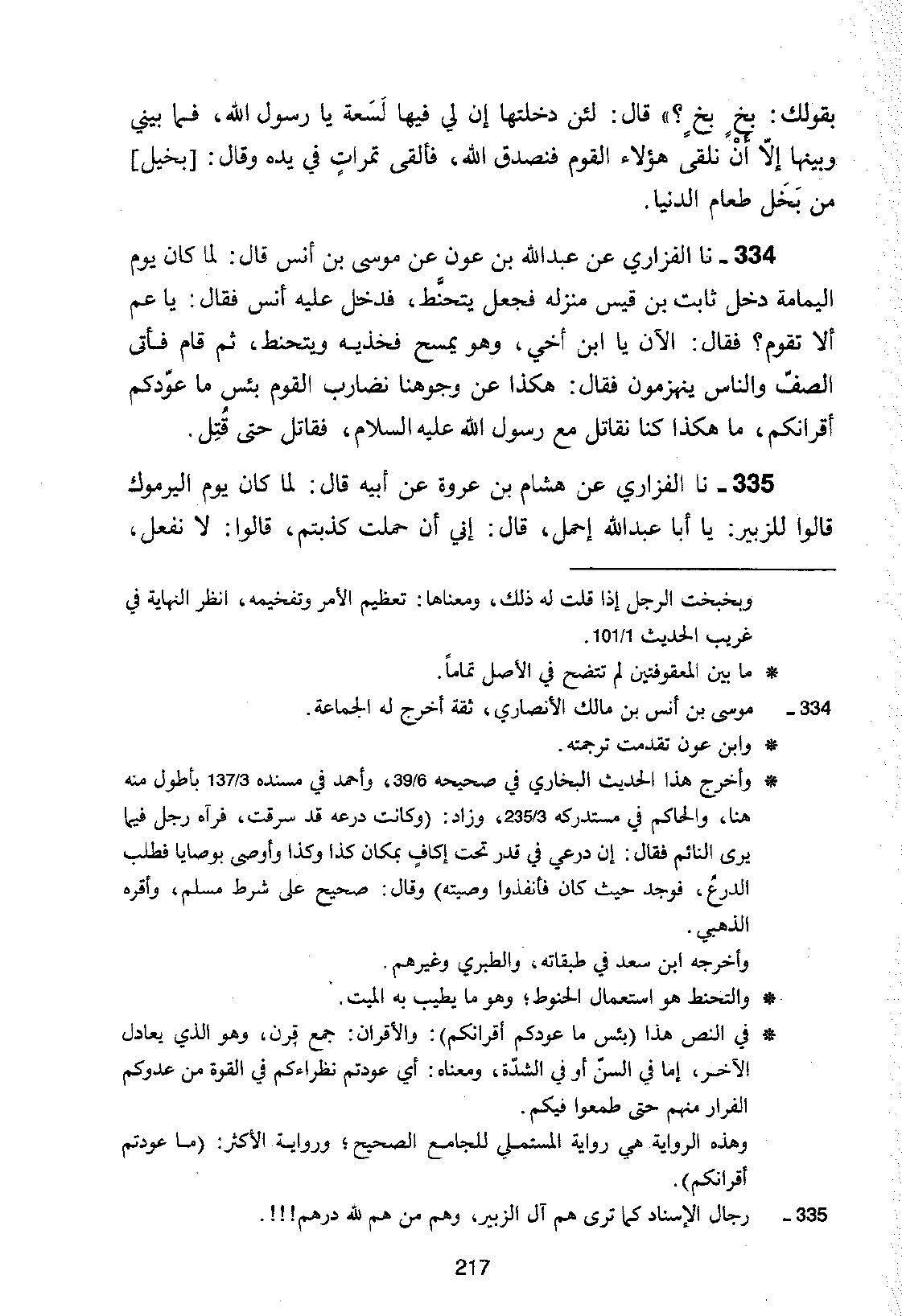 335 - نا الْفَزَارِيُّ، عَنْ هِشَامِ بْنِ عُرْوَةَ، عَنْ أَبِيهِ، قَالَ: لَمَّا كَانَ يَوْمُ الْيَرْمُوكِ قَالُوا لِلزُّبَيْرِ: يَا أَبَا عَبْدِ اللَّهِ احْمِلْ قَالَ: " §إِنِّي إِنْ حَمَلْتُ كَذَبْتُمْ قَالُوا: لَا نَفْعَلُ -[218]- قَالَ: «بَلَى وَاللَّهِ لَنَفْعَلَنَّ» ثُمَّ حَمَلَ مَا مَعَهُ أَحَدٌ مِنَ النَّاسِ حَتَّى خَرَقَ الْمُشْرِكِينَ، ثُمَّ وَقَفَ، ثُمَّ حَمَلَ الثَّانِيَةَ فَأَخَذُوا بِلِجَامِهِ فَضَرَبُوهُ ضَرْبَتَيْنِ فِي عَاتِقِهِ، وَانْفَلَتَ عَبْدُ اللَّهِ بْنُ الزُّبَيْرِ الَّذِي كَانَ يَحْفَظُهُ وَهُوَ ابْنُ عَشْرِ سِنِينَ فَجَعَلَ يُذَفِّفُ عَلَى الْجَرْحَى