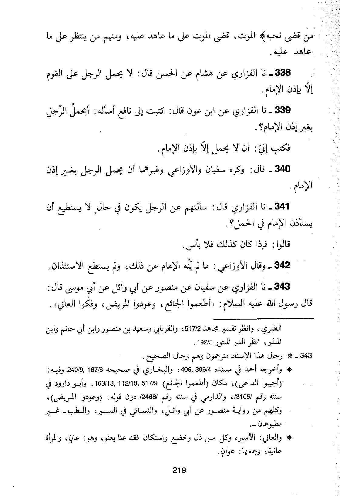 340 - قَالَ: وَكَرِهَ سُفْيَانُ، وَالْأَوْزَاعِيُّ وَغَيْرُهُمَا أَنْ يَحْمِلَ الرَّجُلُ بِغَيْرِ إِذْنِ الْإِمَامِ.