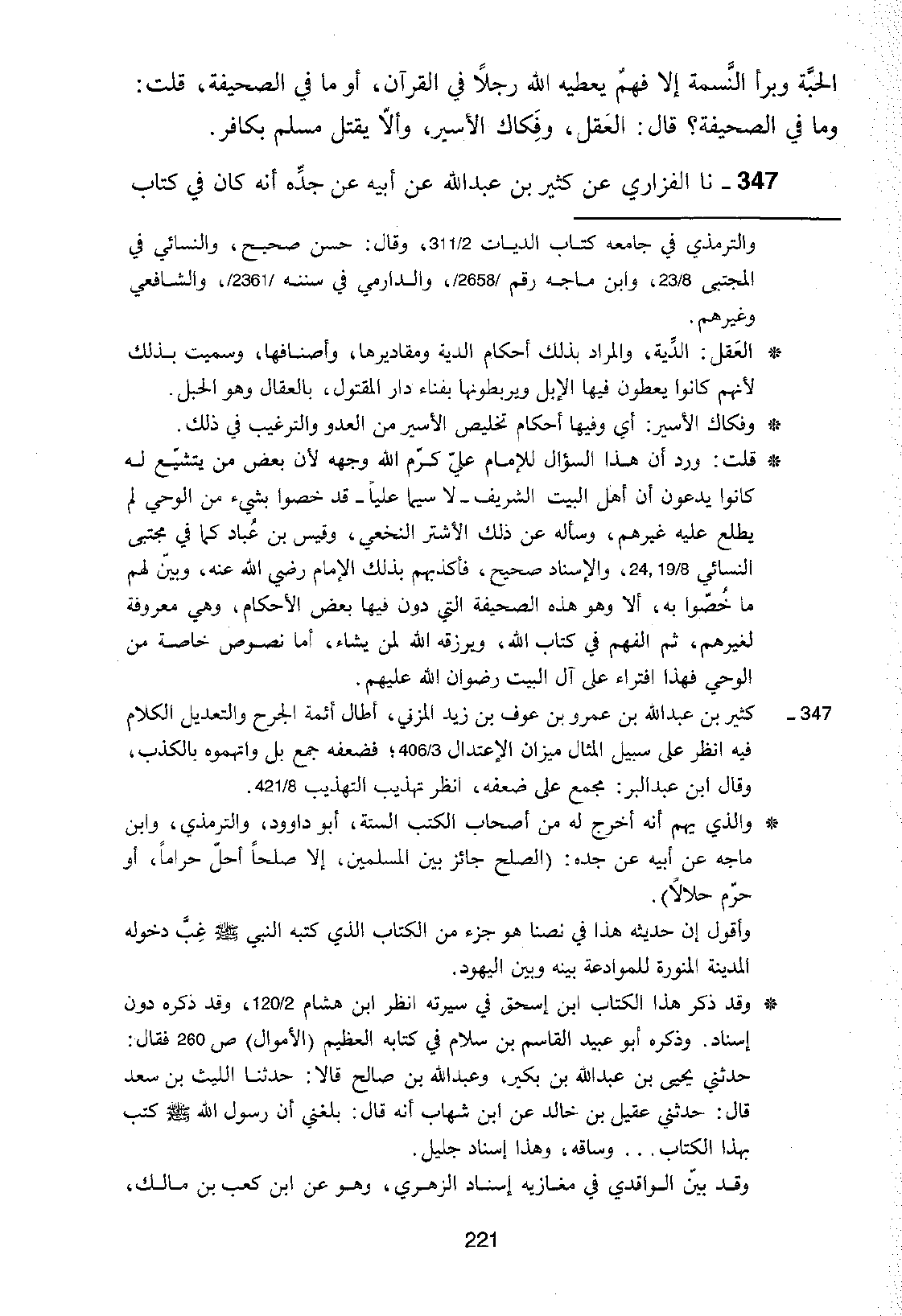347 - نا الْفَزَارِيُّ، عَنْ كَثِيرِ بْنِ عَبْدِ اللَّهِ، عَنْ أَبِيهِ، عَنْ جَدِّهِ، أَنَّهُ كَانَ فِي كِتَابِ -[222]- النَّبِيِّ عَلَيْهِ السَّلَامُ أَنَّ §كُلَّ طَائِفَةٍ تَفْدِي عَانِيَهَا بِالْمَعْرُوفِ وَالْقِسْطِ بَيْنَ الْمُؤْمِنِينَ، وَأَنَّ عَلَى الْمُؤْمِنِينَ أَنْ لَا يَتْرُكُوا مُفْرَحًا مِنْهُمْ حَتَّى يُعْطُوهُ فِي فِدَاءٍ أَوْ عَقْلٍ