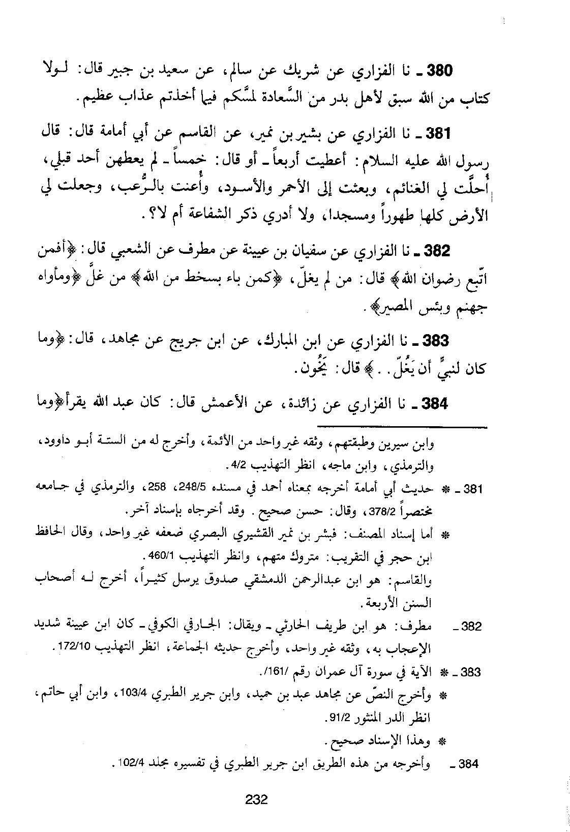 382 - نا الْفَزَارِيُّ، عَنْ سُفْيَانَ بْنِ عُيَيْنَةَ، عَنْ مُطَرِّفٍ، عَنِ الشَّعْبِيِّ، قَالَ: {§أَفَمَنِ اتَّبَعَ رِضْوَانَ اللَّهِ} [آل عمران: 162] قَالَ: «مَنْ لَمْ يَغُلَّ» ، {كَمَنْ بَاءَ بِسَخَطٍ مِنَ اللَّهِ} [آل عمران: 162] «مَنْ غَلَّ» {وَمَأْوَاهُ جَهَنَّمُ وَبِئْسَ الْمَصِيرُ} [آل عمران: 162]
