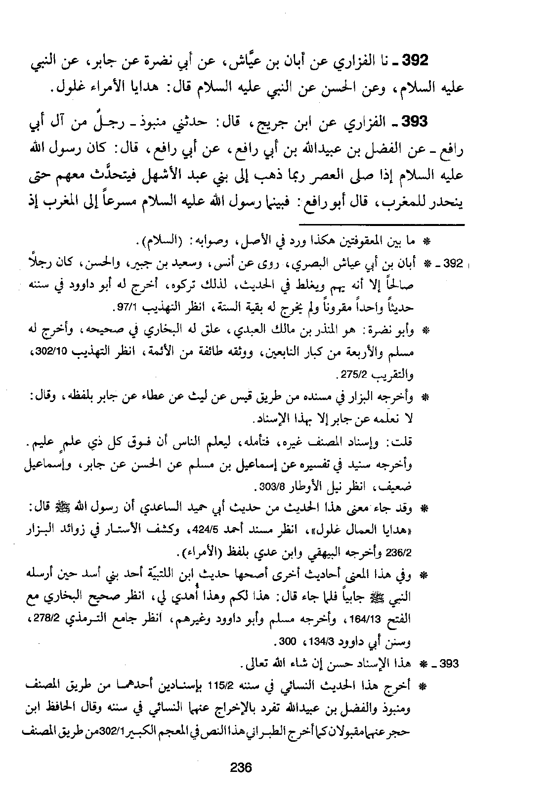 392 - نا الْفَزَارِيُّ، عَنْ أَبَانَ بْنِ أَبِي عَيَّاشٍ، عَنْ أَبِي نَضْرَةَ، عَنْ جَابِرٍ، عَنِ النَّبِيِّ عَلَيْهِ السَّلَامُ، وَعَنِ الْحَسَنِ، عَنِ النَّبِيِّ عَلَيْهِ السَّلَامُ قَالَ: «§هَدَايَا الْأُمَرَاءِ غُلُولٌ»