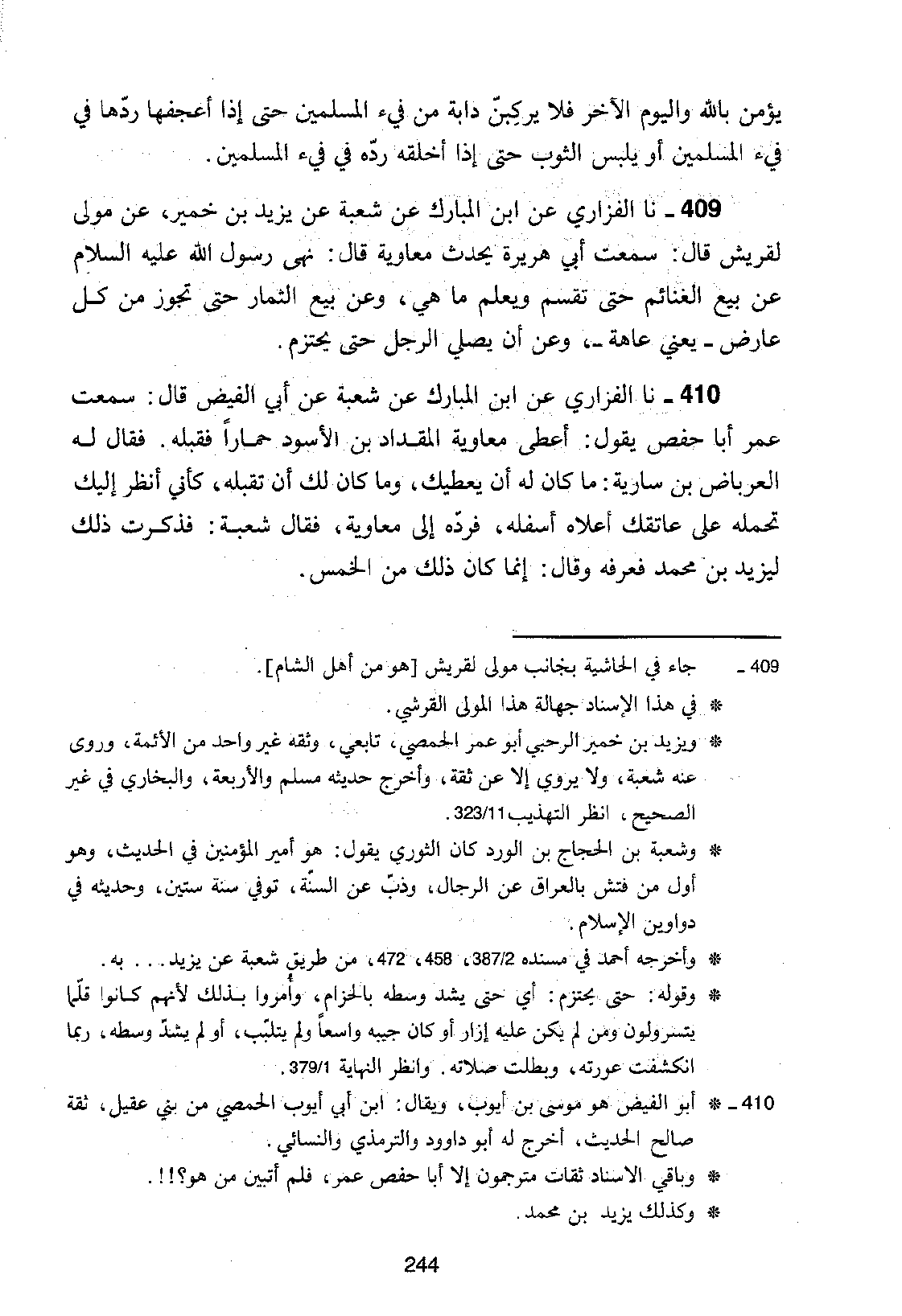 409 - نا الْفَزَارِيُّ، عَنِ ابْنِ الْمُبَارَكِ، عَنْ شُعْبَةَ، عَنْ يَزِيدَ بْنِ خُمَيْرٍ، عَنْ مَوْلًى، لِقُرَيْشٍ قَالَ: سَمِعْتُ أَبَا هُرَيْرَةَ يُحَدِّثُ مُعَاوِيَةَ قَالَ: §نَهَى رَسُولُ اللَّهِ عَلَيْهِ السَّلَامُ عَنْ بَيْعِ الْغَنَائِمِ حَتَّى تُقْسَمَ وَيُعْلَمَ مَا هِيَ، وَعَنْ بَيْعِ الثِّمَارِ حَتَّى تَجُوزَ مِنْ كُلِّ عَارِضٍ - يَعْنِي عَاهَةً - وَعَنْ أَنْ يُصَلِّيَ الرَّجُلُ حَتَّى يَحْتَزِمَ