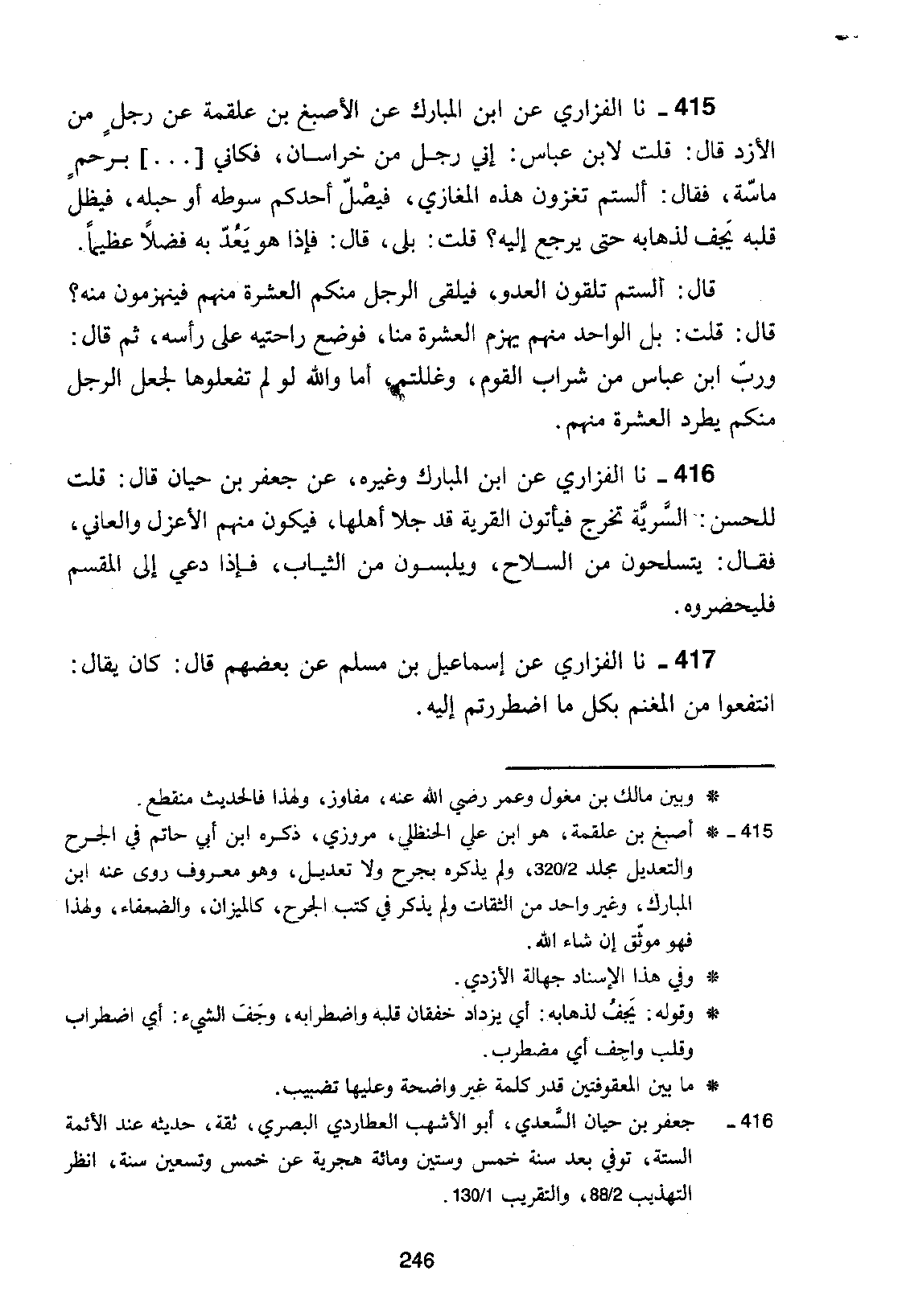 415 - نا الْفَزَارِيُّ، عَنِ ابْنِ الْمُبَارَكِ، عَنِ الْأَصْبَغِ بْنِ عَلْقَمَةَ، عَنْ رَجُلٍ مِنَ الْأَزْدِ قَالَ: قُلْتُ لِابْنِ عَبَّاسٍ: إِنِّي رَجُلٌ مِنْ خُرَاسَانَ، فَكَأَنِّي بِرَحِمِ. . . مَاسَةٍ، فَقَالَ: أَلَسْتُمْ تَغْزُونَ هَذِهِ الْمَغَازِيَ، فَيَضِلَّ أَحَدُكُمْ سَوْطَهُ أَوْ حَبْلَهُ، فَيَظَلُّ قَلْبُهُ يَجِفُّ لِذِهَابِهِ حَتَّى يَرْجِعَ إِلَيْهِ؟ قُلْتُ: بَلَى قَالَ: فَإِذَا هُوَ يَعُدُّ بِهِ فَضْلًا عَظِيمًا قَالَ: " §أَلَسْتُمْ تَلْقَوْنَ الْعَدُوَّ، فَيَلْقَى الرَّجُلُ مِنْكُمُ الْعَشَرَةَ مِنْهُمْ فَيَنْهَزِمُونَ مِنْهُ؟ قَالَ: قُلْتُ: بَلِ الْوَاحِدُ مِنْهُمْ يَهْزِمُ الْعَشَرَةَ مِنَّا، فَوَضَعَ رَاحَتَيْهِ عَلَى رَأْسِهِ، ثُمَّ قَالَ: وَرَبِّ ابْنِ عَبَّاسٍ مِنْ شَرَابِ الْقَوْمِ، وَغَلَلْتُمْ، أَمَا وَاللَّهِ لَوْ لَمْ تَفْعَلُوهَا لَجُعِلَ الرَّجُلُ مِنْكُمْ يَطْرِدُ الْعَشَرَةَ مِنْهُمْ "