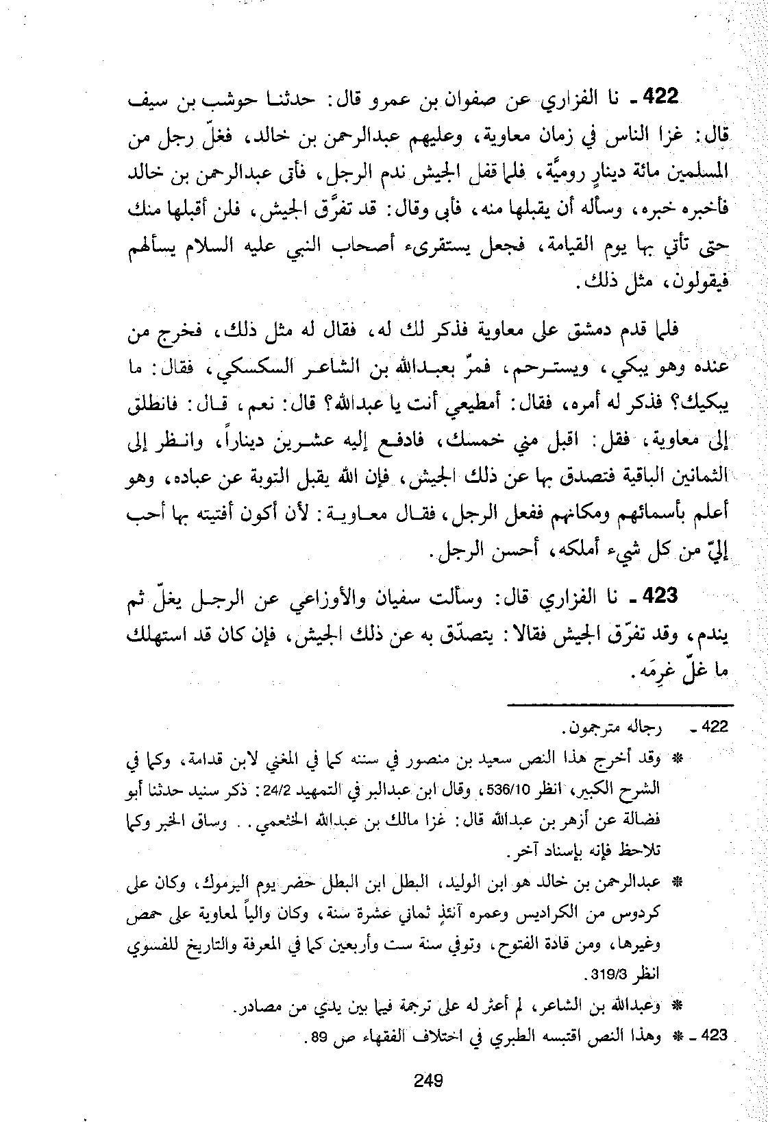 422 - نا الْفَزَارِيُّ، عَنْ صَفْوَانَ بْنِ عَمْرٍو، قَالَ: حَدَّثَنَا حَوْشَبُ بْنُ سَيْفٍ، قَالَ: غَزَا النَّاسُ فِي زَمَانِ مُعَاوِيَةَ، وَعَلَيْهِمْ عَبْدُ الرَّحْمَنِ بْنُ خَالِدٍ، فَغَلَّ رَجُلٌ مِنَ الْمُسْلِمِينَ مِائَةَ دِينَارٍ رُومِيَّةً، فَلَمَّا قَفَلَ الْجَيْشُ نَدِمَ الرَّجُلُ، فَأَتَى عَبْدَ الرَّحْمَنِ بْنَ خَالِدٍ فَأَخْبَرَهُ خَبَرَهُ، وَسَأَلَهُ أَنْ يَقْبَلَهَا مِنْهُ، فَأَبَى، وَقَالَ: قَدْ تَفَرَّقَ الْجَيْشُ، فَلَنْ أَقْبَلَهَا مِنْكَ حَتَّى تَأْتِي بِهَا يَوْمَ الْقِيَامَةِ، فَجَعَلَ يَسْتَقْرِئُ أَصْحَابَ النَّبِيِّ عَلَيْهِ السَّلَامُ يَسْأَلُهُمْ، فَيَقُولُونَ مِثْلَ ذَلِكَ فَلَمَّا قَدِمَ دِمَشْقَ عَلَى مُعَاوِيَةَ فَذَكَرَ ذَلِكَ لَهُ، فَقَالَ لَهُ مِثْلَ ذَلِكَ، فَخَرَجَ مِنْ عِنْدِهِ وَهُوَ يَبْكِي، وَيَسْتَرْحِمُ، فَمَرَّ بِعَبْدِ اللَّهِ بْنِ الشَّاعِرِ السَّكْسَكِيِّ، فَقَالَ: مَا يُبْكِيكَ؟ فَذَكَرَ لَهُ أَمْرَهُ، فَقَالَ: أَمُطِيعِي أَنْتَ يَا عَبْدَ اللَّهِ؟ قَالَ: نَعَمْ، قَالَ: فَانْطَلِقْ إِلَى مُعَاوِيَةَ، فَقُلِ: اقْبَلْ مِنِّي خُمْسَكَ، فَادْفَعْ إِلَيْهِ عِشْرِينَ دِينَارًا، وَانْظُرْ إِلَى الثَّمَانِينَ الْبَاقِيَةِ فَتَصَدَّقْ بِهَا عَنِ ذَلِكَ الْجَيْشِ، فَإِنَّ اللَّهَ يَقْبَلُ التَّوْبَةَ عَنْ عِبَادِهِ، وَهُوَ أَعْلَمُ بِأَسْمَائِهِمْ وَمَكَانِهِمْ، فَفَعَلَ الرَّجُلُ، فَقَالَ مُعَاوِيَةُ: §لَأَنْ أَكُونَ أَفْتَيْتُهُ بِهَا أَحَبُّ إِلَيَّ مِنْ كُلِّ شَيْءٍ أَمْلِكُهُ، أَحْسَنَ الرَّجُلُ.