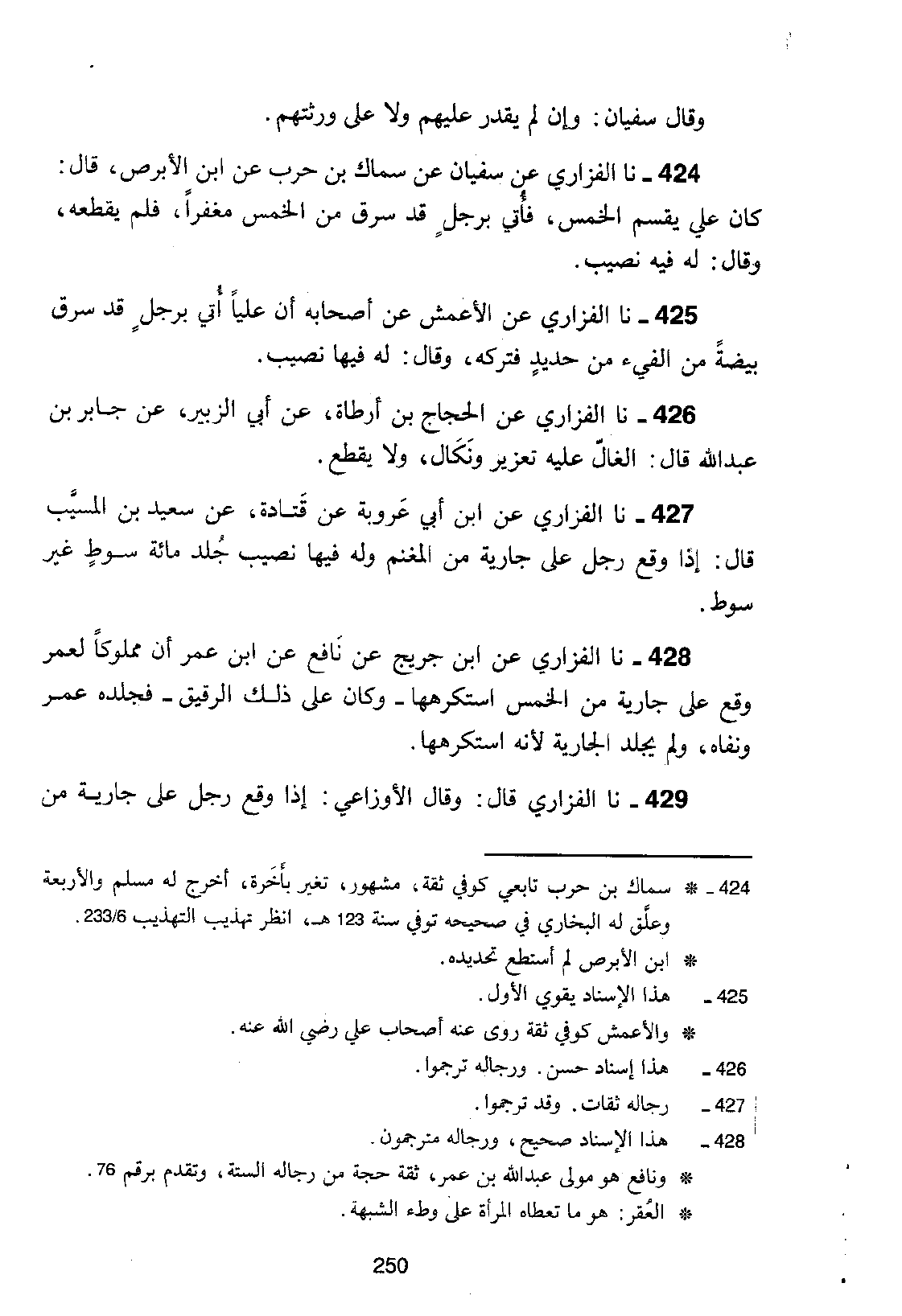 424 - نا الْفَزَارِيُّ، عَنْ سُفْيَانَ، عَنْ سِمَاكِ بْنِ حَرْبٍ، عَنِ ابْنِ الْأَبْرَصِ، قَالَ: كَانَ عَلِيٌّ: §يَقْسِمُ الْخُمُسَ، فَأُتِيَ بِرَجُلٍ قَدْ سَرَقَ مِنَ الْخُمُسِ مِغْفَرًا، فَلَمْ يَقْطَعْهُ، وَقَالَ: لَهُ فِيهِ نَصِيبٌ