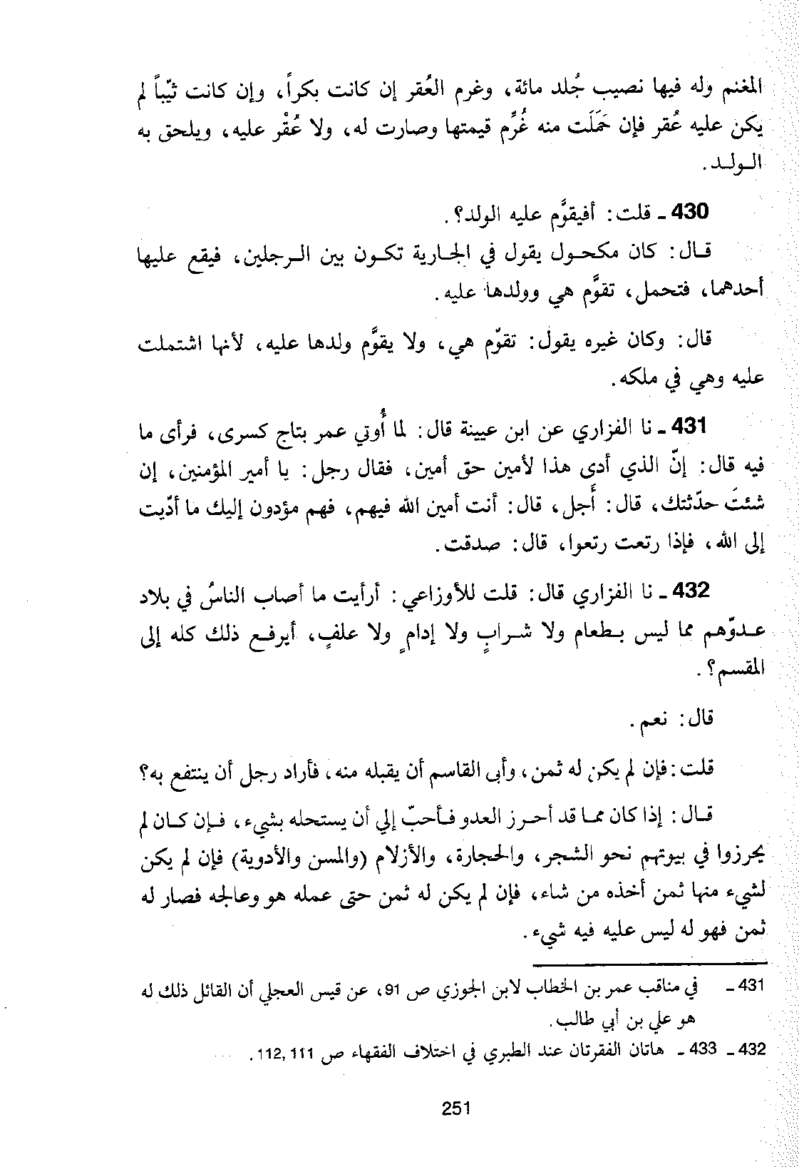 432 - نا الْفَزَارِيُّ قَالَ: قُلْتُ لِلْأَوْزَاعِيِّ: أَرَأَيْتَ مَا أَصَابَ النَّاسَ فِي بِلَادِ عَدُوِّهِمْ مِمَّا لَيْسَ بِطَعَامٍ وَلَا شَرَابٍ وَلَا إِدَامٍ، وَلَا عَلَفٍ، أَيُرْفَعُ ذَلِكَ كُلُّهُ إِلَى الْمَقْسَمِ؟ قَالَ: نَعَمْ قُلْتُ: فَإِنْ لَمْ يَكُنْ لَهُ ثَمَنٌ، وَأَبَى الْقَاسِمُ أَنْ يَقْبَلَهُ مِنْهُ، فَأَرَادَ رَجُلٌ أَنْ يَنْتَفِعَ بِهِ؟ قَالَ: إِذَا كَانَ مِمَّا قَدْ أَحْرَزَ الْعَدُوُّ فَأَحَبَّ إِلَيَّ أَنْ يَسْتَحِلَّهُ بِشَيْءٍ، فَإِنْ كَانَ لَمْ يُحْرِزُوا فِي بُيُوتِهِمْ نَحْوَ الشَّجَرِ وَالْحِجَارَةِ وَالْأَزْلَامِ وَالْمِسَنِ وَالْأَدْوِيَةِ، فَإِنْ لَمْ يَكُنْ لِشَيْءٍ مِنْهَا ثَمَنٌ أَخَذَهُ مَنْ شَاءَ، فَإِنْ لَمْ يَكُنْ لَهُ ثَمَنٌ حَتَّى عَمَلَهُ هُوَ وَعَالَجَهُ فَصَارَ لَهُ -[252]- ثَمَنٌ فَهُوَ لَهُ لَيْسَ عَلَيْهِ فِيهِ شَيْءٌ قَالَ: وَكَانَ مَكْحُولٌ يَقُولُ ذَلِكَ.