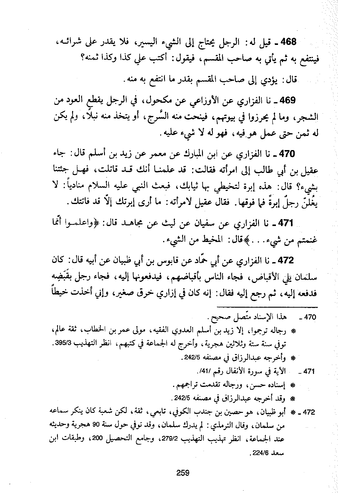 470 - نا الْفَزَارِيُّ، عَنِ ابْنِ الْمُبَارَكِ، عَنْ مَعْمَرٍ، عَنْ زَيْدِ بْنِ أَسْلَمَ، قَالَ: جَاءَ عَقِيلُ بْنُ أَبِي طَالِبٍ إِلَى امْرَأَتِهِ فَقَالَتْ: قَدْ عَلِمْنَا أَنَّكَ قَدْ قَاتَلْتَ، فَهَلْ جِئْتَنَا بِشَيْءٍ؟ قَالَ: هَذِهِ إِبْرَةٌ لِتَخِيطِي بِهَا ثِيَابَكِ، فَبَعَثَ النَّبِيُّ عَلَيْهِ السَّلَامُ مُنَادِيًا: «§لَا يَغُلَّنَّ رَجُلٌ إِبْرَةً فَمَا فَوْقَهَا» فَقَالَ عَقِيلٌ لِامْرَأَتِهِ: مَا أَرَى إِبْرَتَكِ إِلَّا قَدْ فَاتَتْكِ