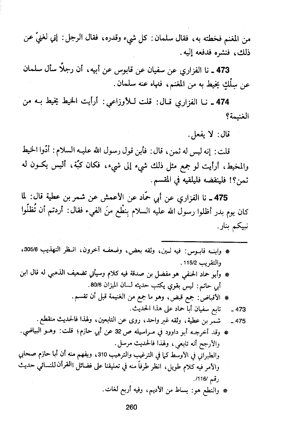 473 - نا الْفَزَارِيُّ، عَنْ سُفْيَانَ، عَنْ قَابُوسَ، عَنْ أَبِيهِ، أَنَّ رَجُلًا §سَأَلَ سَلْمَانَ عَنْ سَلَكٍ يَخِيطُ بِهِ مِنَ الْمَغْنَمِ، فَنَهَاهُ عَنْهُ سَلْمَانُ.