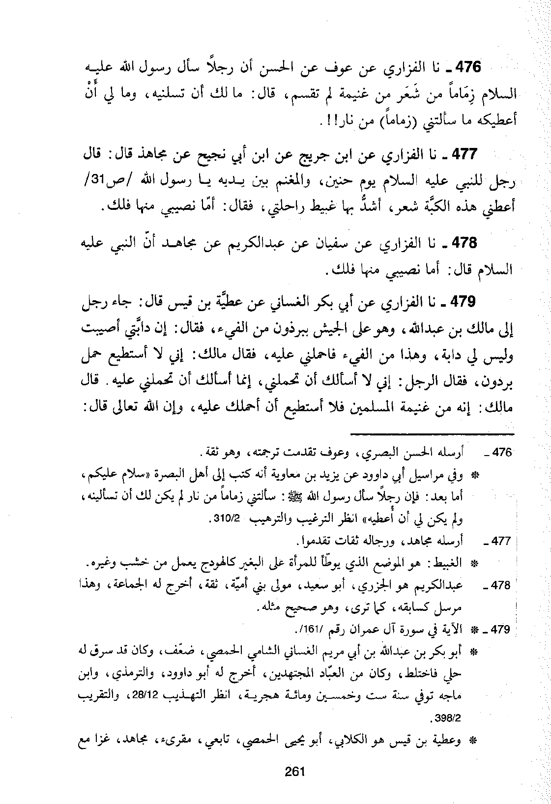 477 - نا الْفَزَارِيُّ، عَنِ ابْنِ جُرَيْجٍ، عَنِ ابْنِ أَبِي نَجِيحٍ، عَنْ مُجَاهِدٍ، قَالَ: قَالَ رَجُلٌ لِلنَّبِيِّ عَلَيْهِ السَّلَامُ يَوْمَ حُنَيْنٍ، وَالْمَغْنَمُ بَيْنَ يَدَيْهِ: يَا رَسُولَ اللَّهِ، أَعْطِنِي هَذِهِ الْكُبَّةَ شَعَرٍ، أَشُدُّ بِهَا غَبِيطَ رَاحِلَتِي فَقَالَ: «§أَمَّا نَصِيبِي مِنْهَا فَلَكَ»
