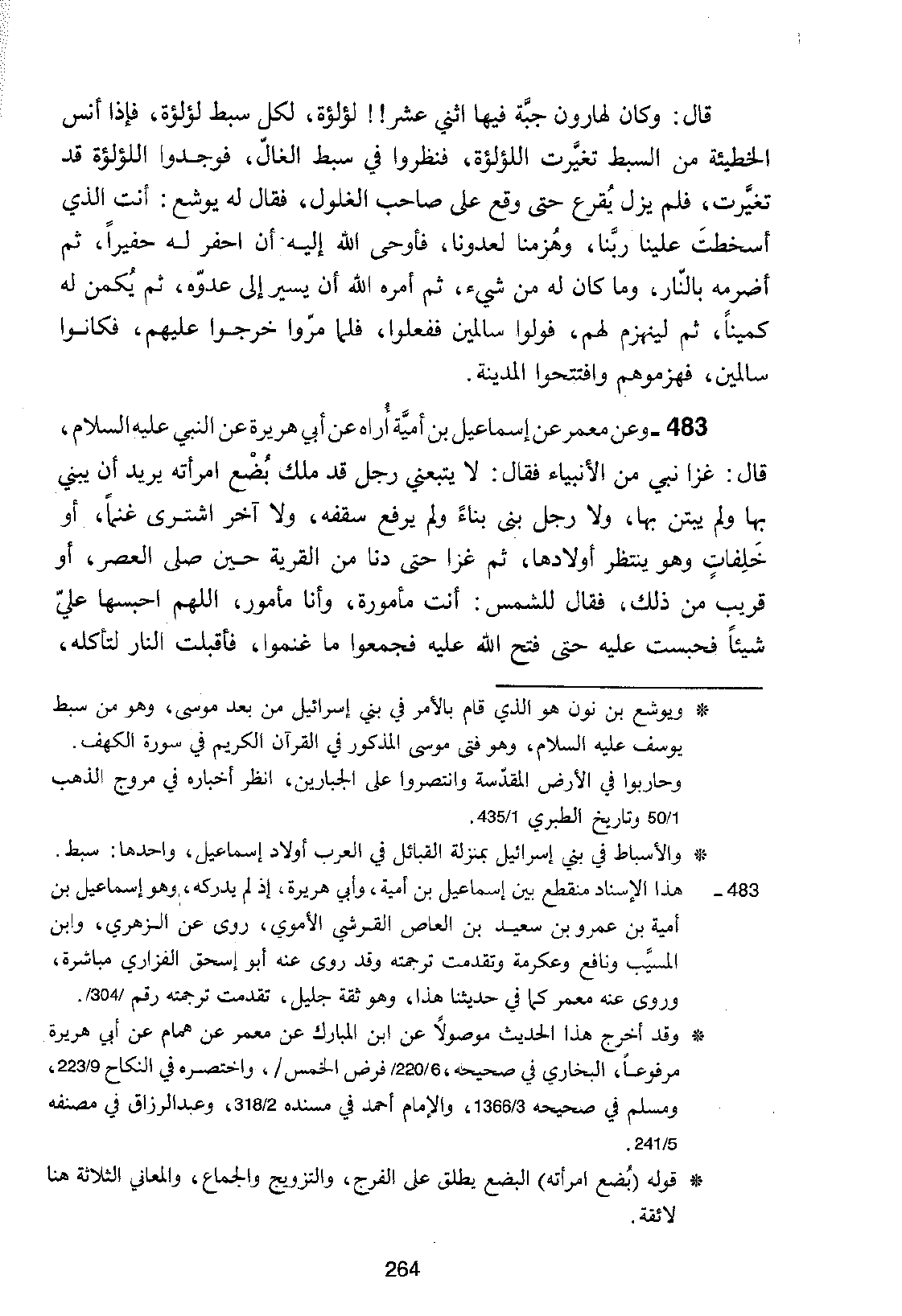 483 - وعَنْ مَعْمَرٍ، عَنْ إِسْمَاعِيلَ بْنِ أُمَيَّةَ، أُرَاهُ، عَنْ أَبِي هُرَيْرَةَ، عَنِ النَّبِيِّ عَلَيْهِ السَّلَامُ، قَالَ: " §غَزَا نَبِيٌّ مِنَ الْأَنْبِيَاءِ فَقَالَ: لَا يَتْبَعْنِي رَجُلٌ قَدْ مَلَكَ بُضْعَ امْرَأَتِهِ يُرِيدُ أَنْ يَبْنِيَ بِهَا وَلَمْ يَبْتَنِ بِهَا، وَلَا رَجُلٌ بَنَى بِنَاءً وَلَمْ يَرْفَعْ سَقْفَهُ، وَلَا آخَرُ اشْتَرَى غَنَمًا، أَوْ خَلِفَاتٍ وَهُوَ يَنْتَظِرُ أَوْلَادَهَا، ثُمَّ غَزَا حَتَّى دَنَا مِنَ الْقَرْيَةِ حِينَ صَلَّى الْعَصْرَ، أَوْ قَرِيبٍ مِنْ ذَلِكَ، فَقَالَ لِلشَّمْسِ: أَنْتِ مَأْمُورَةٌ، وَأَنَا مَأْمُورٌ، اللَّهُمَّ احْبِسْهَا عَلَيَّ شَيْئًا فَحُبِسَتْ عَلَيْهِ حَتَّى فَتَحَ اللَّهُ عَلَيْهِ فَجَمَعُوا مَا غَنِمُوا، فَأَقْبَلْتِ النَّارُ لِتَأْكُلَهُ، -[265]- فَأَبَتْ أَنْ تَطْعَمَهُ، فَقَالَ: فِيكُمْ غُلُولٌ، فَلْيُبَايِعْنِي مِنْ كُلِّ قَبِيلَةٍ رَجُلٌ، فَلَزِقَتْ يَدُ رَجُلَيْنِ أَوْ ثَلَاثَةٍ بِيَدِهِ، فَقَالَ: فِيكُمْ غُلُولٌ، أَنْتُمْ غَلَلْتُمْ، فَأَخْرَجُوا مِثْلَ رَأْسِ الْبَقَرَةِ مِنْ ذَهَبٍ، فَوَضَعُوهُ فِي الْمَالِ، وَهُوَ بِالصَّعِيدِ، فَأَقْبَلَتِ النَّارُ فَأَكَلَتْهُ، فَلَمْ تَحِلَّ الْغَنَائِمُ لِمَنْ كَانَ قَبْلَنَا، وَذَلِكَ بِأَنَّ اللَّهَ عَلِمَ ضَعْفَنَا وَعَجْزَنَا فَطَيَّبَهَا لَنَا "