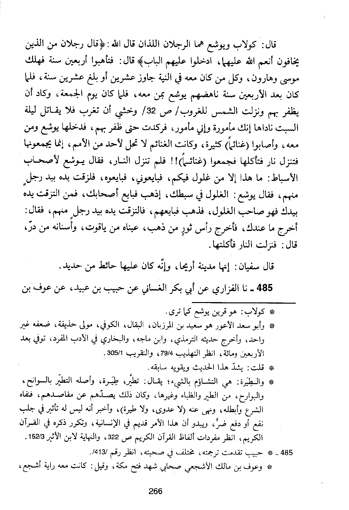 485 - نا الْفَزَارِيُّ، عَنْ أَبِي بَكْرٍ الْغَسَّانِيِّ، عَنْ حَبِيبِ بْنِ عُبَيْدٍ، عَنْ عَوْفِ بْنِ -[267]- مَالِكِ، قَالَ: أُتِيَ حَبِيبُ بْنُ مَسْلَمَةَ بِرَجُلٍ قَدْ غَلَّ، وَكَانَ أَوَّلُ غُلُولٍ، أُرَاهُ الشَّامَ، فَقَامَ فَحَمِدَ اللَّهَ، وَأَثْنَى عَلَيْهِ فَقَالَ: §إِيَّاكُمْ وَمَا لَا كَفَّارَةَ لَهُ مِنَ الذُّنُوبِ، إِنَّ الرَّجُلَ لَيَزْنِي ثُمَّ يَتُوبُ فَيَتُوبُ اللَّهُ عَلَيْهِ، وَإِنَّ الرَّجُلَ لَيَسْرِقُ ثُمَّ يَتُوبُ فَيَتُوبُ اللَّهُ عَلَيْهِ، وَإِنَّهُمَا ذَنْبَانِ لَا كَفَّارَةَ لَهُمَا: الْغُلُولُ وَالرِّبَا، فَإِنَّ اللَّهَ قَالَ: {وَمَنْ يَغْلُلْ يَأْتِ بِمَا غَلَّ يَوْمَ الْقِيَامَةِ} [آل عمران: 161] فَلَا كَفَّارَةَ لِصَاحِبِ الْغُلُولِ، حَتَّى يَأْتِيَ بِمَا غَلَّ يَوْمَ الْقِيَامَةِ يَحْمِلُهُ عَلَى ظَهْرِهِ، وَإِنَّ آكِلَ الرِّبَا يَجِيءُ يَوْمَ الْقِيَامَةِ مَجْنُونًا يُخْنَقُ "