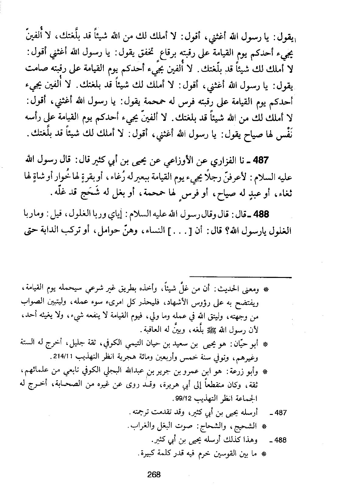 487 - نا الْفَزَارِيُّ، عَنِ الْأَوْزَاعِيِّ، عَنْ يَحْيَى بْنِ أَبِي كَثِيرٍ، قَالَ: قَالَ رَسُولُ اللَّهِ عَلَيْهِ السَّلَامُ: «§لَأَعْرِفَنَّ رَجُلًا يَجِيءُ يَوْمَ الْقِيَامَةِ بِبَعِيرٍ لَهُ رُغَاءٌ، أَوْ بَقَرَةٍ لَهَا خُوَارٌ أَوْ شَاةٍ لَهَا ثُغَاءٌ، أَوْ عَبْدٍ لَهُ صِيَاحٌ، أَوْ فَرَسٍ لَهَا حَمْحَمَةٌ، أَوْ بَغْلٍ لَهُ شَحْجٌ قَدْ غَلَّهُ»
