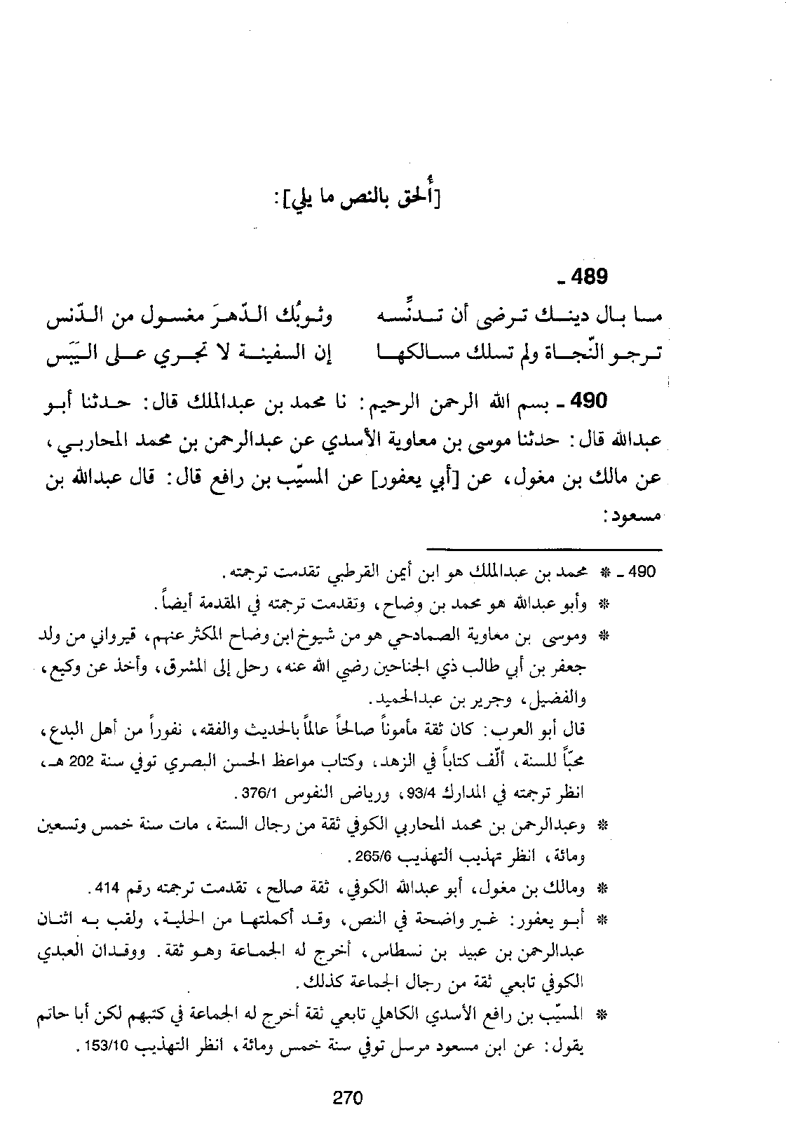 490 - نا مُحَمَّدُ بْنُ عَبْدِ الْمَلِكِ، قَالَ: حَدَّثَنَا أَبُو عَبْدِ اللَّهِ، قَالَ: حَدَّثَنَا مُوسَى بْنُ مُعَاوِيَةَ الْأَسَدِيُّ، عَنْ عَبْدِ الرَّحْمَنِ بْنِ مُحَمَّدٍ الْمُحَارِبِيِّ، عَنْ مَالِكِ بْنِ مِغْوَلٍ، عَنْ أَبِي يَعْفُورَ، عَنِ الْمُسَيِّبِ بْنِ رَافِعٍ، قَالَ: قَالَ عَبْدُ اللَّهِ بْنُ مَسْعُودٍ: -[271]- «§يَنْبَغِي لِحَامِلِ الْقُرْآنِ أَنْ يُعْرَفَ بِلَيْلِهِ إِذِ النَّاسُ نَائِمُونَ، وَبِنَهَارِهِ إِذِ النَّاسُ يَفْرُطُونَ، وَبِحُزْنِهِ إِذِ النَّاسُ فَرِحُونَ، وَبُكَائِهِ إِذِ النَّاسُ يَضْحَكُونَ، وَبِصَمْتِهِ إِذِ النَّاسُ يَخْلِطُونَ، وَبِخُشُوعِهِ إِذِ النَّاسُ يَخْتَالُونَ، وَيَنْبَغِي لِحَامِلِ الْقُرْآنِ أَنْ يَكُونَ مَحْزُونًا، حَكِيمًا عَلِيمًا، وَلَا يَنْبَغِي لِحَامِلِ الْقُرْآنِ أَنْ يَكُونَ جَافِيًا وَلَا غَافِلًا، وَلَا صَيَّاحًا حَدِيدًا»