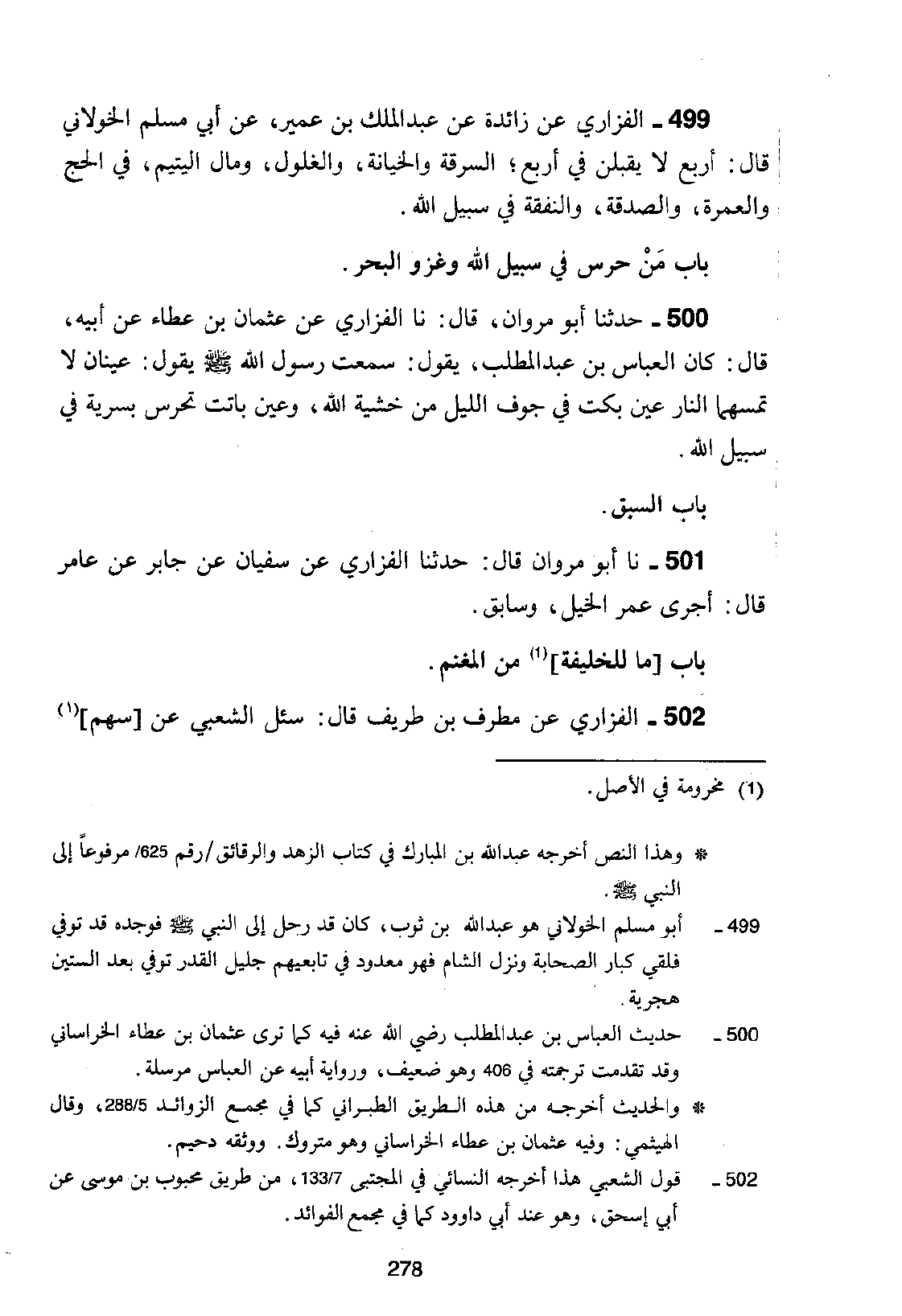 502 - الْفَزَارِيُّ، عَنْ مُطَرِّفِ بْنِ طَرِيفٍ، قَالَ: " سُئِلَ الشَّعْبِيُّ عَنْ سَهْمِ -[279]- النَّبِيِّ عَلَيْهِ السَّلَامُ وَصَفِيِّهِ فَقَالَ: «§أَمَّا سَهْمُ رَسُولِ اللَّهِ فَكَسَهْمِ رَجُلٍ مِنَ الْمُسْلِمِينَ، وَأَمَّا الْمُصَفَّى فَغُرَّةٌ يَخْتَارُهَا مِنْ أَيِّ شَيْءٍ شَاءَ»