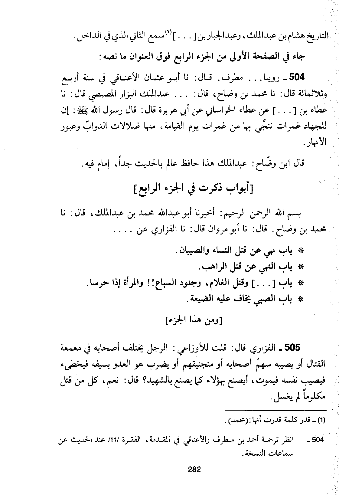 504 - رُوِّينَا عَنْ مُطَرِّفٍ، قَالَ: نا أَبُو عُثْمَانَ الْأَعْنَاقِيُّ، فِي سَنَةِ أَرْبَعٍ وَثَلَاثِمِائَةٍ قَالَ: نا مُحَمَّدُ بْنُ وَضَّاحٍ قَالَ:. . . . . . عَبْدُ الْمَلِكِ الْبَزَّارُ الْمِصِّيصِيُّ قَالَ: نا عَطَاءُ بْنُ أَبِي رَبَاحٍ، عَنْ عَطَاءٍ الْخُرَاسَانِيِّ، عَنْ أَبِي هُرَيْرَةَ قَالَ: قَالَ رَسُولُ اللَّهِ صَلَّى اللهُ عَلَيْهِ وَسَلَّمَ: «إِنَّ §لِلْجِهَادِ غَمَرَاتٍ نُنَجَّى بِهَا مِنْ غَمَرَاتِ يَوْمِ الْقِيَامَةِ، مِنْهَا ضَلَالَاتُ الدَّوَابِّ وَعُبُورُ الْأَنْهَارِ» قَالَ ابْنُ وَضَّاحٍ: " عَبْدُ الْمَلِكِ هَذَا حَافِظٌ عَالِمٌ بِالْحَدِيثِ جِدًّا، إِمَامٌ فِيهِ