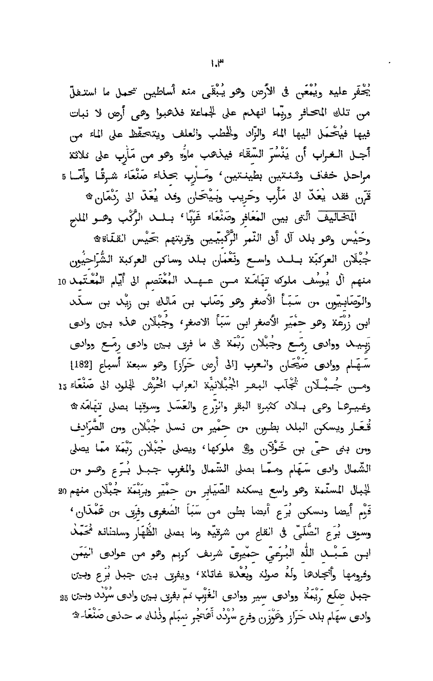 المخاليف التي بين المعافر وصنعاء غرباً: بلد الرّكب وحيس وهو بلد آل أبي النمر الرّكبييّن وقريتهم بحيس القناة جبلان العركبة بلد واسع ونعمان بلد وساكن العركبة الشّراحيّون منهم آل يوسف ملوك تهامة من عهد المعاصم إلى أيام المعتمد الوصابيون من سبأ الأصغر وهو وصاب بن مالك بن زيد بن سدد بن زرعة وهو حمير الأصغر بن سبأ الأصغر وجبلان هذه بين وادي زبيد ووادي رمع، وجبلان ريمة هي ما فرق بين وادي رمع ووادي سهام ووادي صيحان والعرب إلى أرض حراز وهو سبعة سباع ومن جبلان تجلب البقر الجبلانية العرب الحرش الجلود إلى صنعاء وغيرهما وهي بلاد كثيرة البقر والزرع والعسل وسوقها يصلي تهامة، قعار ويسكن البلد بطون من حمير من نسل جبلان ومن الصرّادف ومن بني حيّ بن خولان وهي ملوكها، ويصلي جبلان ريمة مما يصلي الشمال وادي سهام ومما يصلي الشمال والمغرب جبل برع وهو من الجبال المسّنة وهو واسع يسكنه الصّنابر من حمير وبريمة جّبلان منهم قوم أيضاً بطن من سبأ الصغرى وفرق من همدان، وسوق برع الصّليّ في القاع من شرقيه، وما يصلي الظهار، وسلطانه محمد بن عبد الله البرعيّ حميري شريف كريم وهو من عوادي اليمن وقرومها وانجادها وله صولة وبعدة غائلة، ويفرق بين جبل برع وبين جبل ضلع وريمة وادي سير ووادي العرب ثم يفرق بين وادي سردد وبين وادي سهام بلد حزار وهوزن وفرع سردد أهجر شيام وذلك ما حاذي صنعاء.