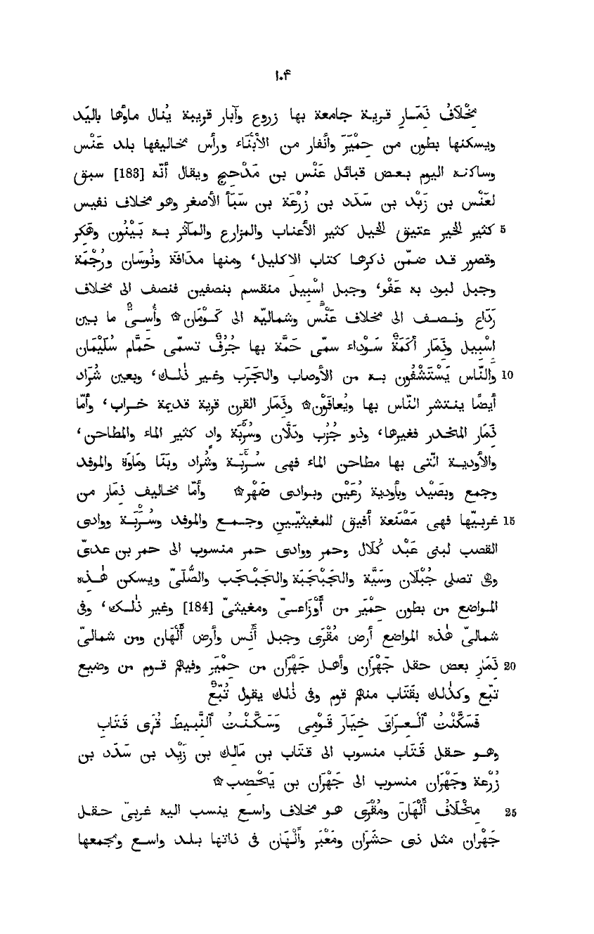مخلاف ذمار: ذمار قرية كبيرة جامعة بها زروع وآبار قربية ينال ماؤه باليد ويسكنها بطون من حمير وأنفار من الأبناء ورأس مخاليفها بلد عنس وساكنه اليوم بعض قبائل عنس بن مذحج، ويقال أنه منسوب لعنس بن زيد بن سدد بن زرعة ابن سبأ الصغر وهو مخلاف نفيس كثير الخير عتيق الخيل كثير الأعناب والمزارع والمآثر به بينون وهكر وقصور قد ضمّن ذكرها كتاب الإكليل ومنها مداقة وبوسان ورخمة وجبل لبؤة بن عنس وجبل اسبيل منقسم بنصفين فنصف إلى مخلاف عنس وشمالية إلى كومان وآسي ما بين إسبيل وذمار، أكمة سوداء تمسى حمّة، بها جرف يسمى حّمام سليمان والناس يستشفون به من الأوصاب والجرب وغير ذلك، وبعين شراد أيضاً ينتشر الناس بها ويعافون وذمار القرن قرية قديمة خراب، وأما ذمار المخدر فغيرها وذو جزب ودلان وسربة واد كثير الماء والمطاحن، والأودية التي بها مطاحن الماء فهي سربة وشراد وبنا وماوة والموفد وجمع، وبصيد، وبأودية رعين وبوادي ضهر وأما مخاليف ذمار من غربيها فهي مصنعة أفيق للمغيثّين وجمع والموفد وسربة ووادي القضب لبني عبد كلال وحمر ووادي حمر منسوب إلى حمر بن عدي وهي تصلي جبلان وسّية والجبجبة وسّية والجبجبة والجبجب والصّلي ويسكن هذه المواضع من بطون حمير من أوزاعي ومغيثي وغير ذلك، وفي شمالي هذه المواضع أرض مقري وجبل أنس وأرض الهان ومن شمالي ذمار بعض حقل جهران، وأهل جهران من حمير وفيهم قوم من وضيع تبع وكذلك بقتاب منهم قوم وفي ذلك يقول تبّع: