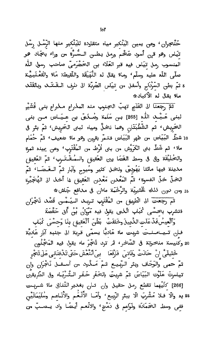 رجعنا إلى الفلج: مهب الجنوب منه المذارع منه المذراع مذراع بني قشير لبني عبد الله بن سلمة وصديّ بن عياض من بني الحريش، ثم الشطبتان وهما نخل ومياه لبني الحريش، ثم بئر في شط البياض من ظهر البياض ثم تمر بقرون وهو ماء ضعيف، ثم حمام ماء، ثم شط بني الكروَّش من بني قرط من المقترب، وعن يمينه تمرة والحليقة وهي في وسط الغضا بين العقيق والمقترب، ثم العقيق مدينة فيها مئتا يهودي ونخل كثير وسيوح وآبار ثم الغضا، ثم الخل خل القسوة، ثم المعدن معدن العقيق فما أخذ إلى الهجيرة ومن دون ذلك الحثبرية والرخمة ماءان في مدافع جاش.