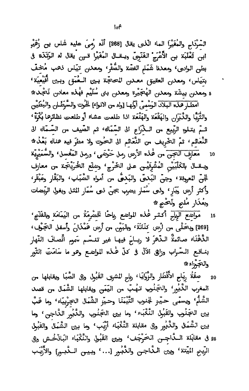 السرادح والمغيرا الماء الذي يقال أنه رمى عليه شأس بن زهير بن ثعلبة بن الأعرج الغنوي وبقابل المغيرا قرن يقال له الوتدة في بطن الوادي، ومعدن شمام الفضة والصُّفر ومعدن تياس ذهب مخفَّ بتياس، ومعدن العقيق ومعدن المحجَّة بين العمق وبين أفيعية، ومعدن بيشة ومعدن الهجيرة ومعدن بني سليم فهذه معادن نجد.