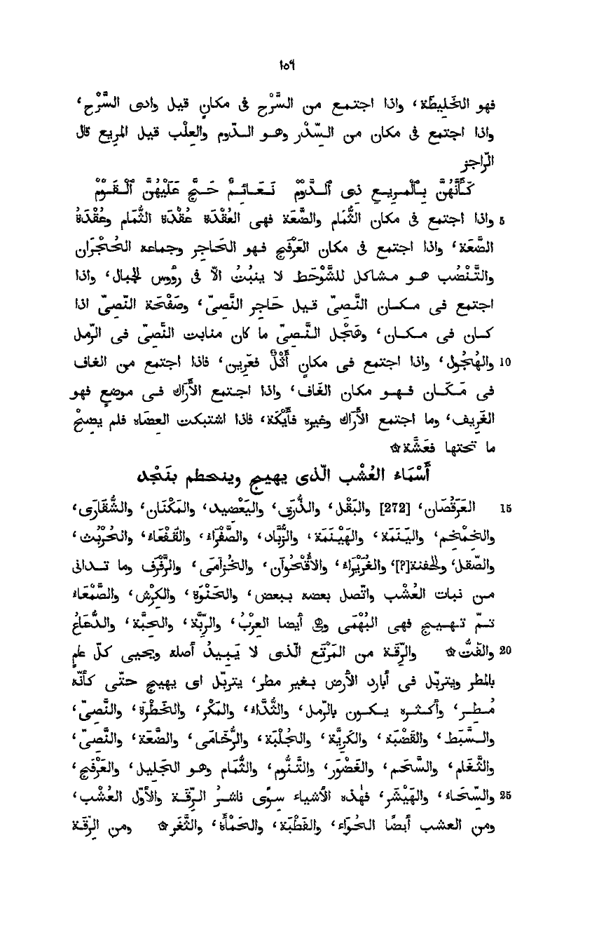 وإذا اجتمع في مكان الثمام والضعة فهي العقدة عقدة الثمام وعقدة الضعة، وإذا اجتمع في مكان العرفج فهو الحاجر وجماعه الحجران والتنضب هو مشاكل لشوحط لا ينبت إلا في رؤوس الجبال، وإذا اجتمع في مكان النصي قيل حاجر النصي، وصفحة النصي إذا كان في مكان، وهجل النصّي ما كان من منابت النصّي في الرمل والهجول، وإذا اجتمع في مكاث أثل مغرين، وإذا اجتمع من الغافي في مكان فهو مكان الغاف، وإذا اجتمع الأراك في موضع فهو الغريف، وما اجتمع الأراك وغيره فأيكة، فإذا اشتبكت العضاه فلم يضحّ ما تحتها فعشَّة.