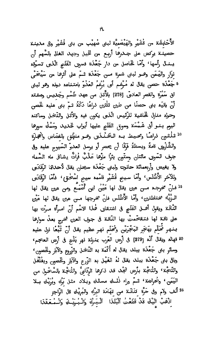 الأحابشة من قشير والهيصمية لبني صهيب من بني قشير وهي مدينة حصيمو يركض على جدارها أربع من الخيل، وجهد الغالي بالسهم أن ينال رأسها، وأما الحاصل من دار جعدة فسوق الفلج الذي تسوقه نزار واليمن وهو لبني أبي سمرة من جعدة ثم على أثرها من سيحي جعدة حصن يقال له مرغم أي يرغم العدو بامتناعه دونه وهو لبني أبي سمرة والقصر العادي من عهد طسم وجديس وصفته أن بانيه بنى حصناً من طين ثلاثين ذراعاً دكّه ثم بنى عليه الحصن وحوله منازل الحاشية للرئيس الذي يكون فيه والأثل والنخل وساكنه اليوم بنو أبي شمسة، وسوق الفلج عليها أبواب الحديد وسمك سورها ثلاثون ذراعاً ومحيط به الخندق وهو منطّق بالقضاض والحجارة والصاروق قامة وبسطة فرقاً أن، يحصر أو يرسل للعدو السيوح عليه وفي جوف السوق مئتان وستون بئراً ماؤها عذب فرات يشاكل ماء السماء ولا يغيض وأربعمئة حانوت، ولبني جعدة سيحان يقال لأحدهما الرَّقادي والآخر الأطلس، وأما سيح قشير فاسمه سيح إسحق، فأما الرقادي فإن مخرجه من عين يقال لها عين ابن أصمع ومن عين يقال لها عين الزبّاء مختلطتين، وأما الأطلس فإن مخرجه من عين يقال لها عين الناقة ويقول أهل الفلج في اشتقاق هذا الاسم إن امرأة مرت بها على ناقة لها فتقحَّمت بها الناقة في جوف العين فخرج بعد سوارها بنهر محلِّم بهجر البحرين ومحلم نهر عظيم يقال إن تبعاً نزل عليه فهاله ويقال إنه في أرض العرب بمنزلة نهر بلخ في أرض العجم، وسائر بين بني جعدة ببلد يقال له أكمة به النخل والزروع والآبار والحصون وباقي بني جعدة ببلد يقال له الغيل به الزرع والآبار والحصون وبغلغل والثُّجَّة بأرض نجد قد ذكرها الرَّداعيُّ والثّجّة بالسحول من اليمن، وبحراضة ثم وراء ذلك مسالك وبلاد مثل برك وبريك بلا ألف ولام وفي حرَّة كنانة من تهامة البرك والبريك قال الراجز: