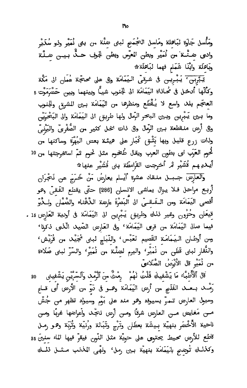 والعارض جبل منقاذ عشرة أيام يعارض من خرج عن نجران أربع مراحل فلا يزال يماشي الإنسان حتى يقطع الفقيء وهو أقصى اليمامة ومن الفقيء إلى البصرة عارضة الدَّهناء والصمَّان والدّوقيعان وحزون وغير ذلك، وطريق يبرين إلى اليمامة في أودية العارض، وفيما صالى اليمامة من قرى اليمامة، وفي العارض الصيد الذي ذكرنا، ومن أوطان اليمامة القصيم لعبس، والنَّباج لبني مجيد من قريش، والنُّقار لبني قطن من نمير، واليرم لضنَّة من نمير، والسرّ لبني صلاءة من نمير قال الأبرص الصَّلائي: