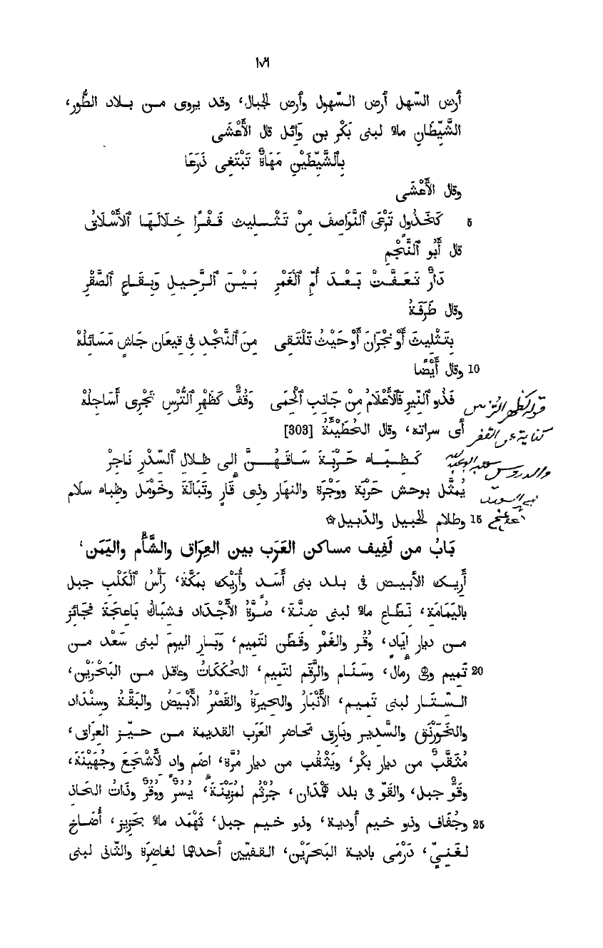 باب من لفيف مساكن العرب بين العراق والشام واليمن: أريك الأبيض في بلد بني أسد وأريك بمكة، رأس الكلب جبل باليمامة، نطاع ماء لبني ضنة، صوَّة الأجداد فشباك باعجة فجائز من ديار إياد، وقر والغمر وقطن لتميم، وبار اليوم لبني سعد من تميم وهي رمال، وسنام والرقم لتميم الحككات وعاقل من البحرين، الستار لبني تميم، الأنبار والحيرة والقصر الأبيض والبقَّة وسنداد والخورنق والسدير وبارق محاضر العرب القديمة من حيز العراق، مثقب من ديار بكر، ويثقب من ديار مرة، إضم واد لأشجع وجهينة، وقو جبل، والقو في بل همدان، جرثم لمزينة يسر ووقر وذات الحاذ وجفاف وذو خيم أودية، وذو خيم جبل، ثهمد ماء بحزيز أضاخ لغني، درمى بادية البحرين، القفيِّين أحدهما لغاضرة والثاني لبني