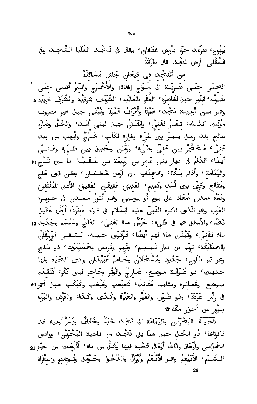 الحمى حمى ضرية إلى سواج والأخرج والنير أقصى حمى ضرية، النير جبل لغاضرة، العقر بالعالية، الشريف شرقيه والشرف غربيّه وهو من أودية نجد، غمرة وأعراف غمرة ولبنى جبل غير معروف مؤنث كذلك، تعار لغني، والقنان جبل لبني أسد، والخل وصارة، عالج بلد رمل يمر بين طيء وفزارة لكلب، شرج وأيهب من بلد غنيّ محجر بين غني وطيء، ورمان وحقيل بين طيء وغني أيضاً، الدام في ديار بني عامر بن ربيعة بن عقيل ما بين ترج واليمامة، وإدام بمكة، والجناب من أرض غطفان، بطن ذي عاج ومتالع وقرى بين أسد وتميم، العقيق عقيقان العقيق الأعلى للمنتفق ومعه معدن صعاد على يوم أو يومين وهو أغزر معدن في جزيرة العرب وهو الذي ذكره النبي عليه السلام في قوله " مطرت أرض عقيل ذهبا " والأسفل هو في طيء، حرس ماء لغنيّ، الفلج وسمسم وجدود ماء لغني، وتبنا ماء لهم أيضاً، قرقرى حيث التقى الزَّبرقان بالحطيئة، تريم من ديار تميم، وتريم وتريس بحضرموت ذو طلح وهو ذو طلوح، جدود ومسحلان وحامر عبيدان وادي الحية ولها حديث، ذو طوالة موضع. ضارج والوتر وحاجر لبني بكر. قتائذة موضع وقصائرة ومثلهما عتائد. شعبعب وغبغب، وكبكب جبل أحمر في رأس عرفة، وذو طوى والعير والعيرة وكدى وكداء والفرش والبرك وعزور من أحواز مكة.