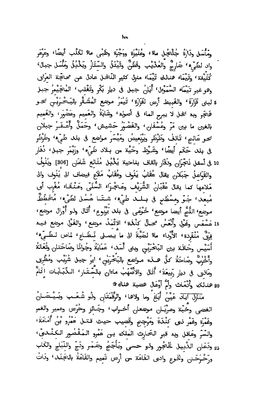 ومأسل ودارة جلجل ماء، وعنيزة ووجرة وظبي ماء لكلب أيضاً، وعرعر واد لطيء، ضارج والعذيب وقطن وثيتل والستار ويذبل ومأسل جبال، كتيفة وتيماء هنالك تيماء منزل كثير النخل عادل عن محجة العراق وهو غير تيماء السموءل، أبان جبل في ديار بكر وتغلب، المجيمر جبل لبني نزارة، والغبيط أرض لفزارة، تيمر موضع، المشقّر بالبحرين نحو هجر وبه نخل لا يبرح الماء في أصوله، وشابة والعميم وغضور والغميم بالغين ما بين مرّ وعسفان، والغضور حشيش وحمل وأعفر جبلان نحو عالج، تاذق وطرطر وبر بعيص وميسر مواضع في بلد طيء، وطرطر في بلد حكم أيضاً، وشوط وحية من بلاد طيء، وزيمر جبل، دفار في أسفل نجران، ودقار بالقاف بناحية يذبل متالع شامان. وينوف والقواعل جبلان يقال عقاب ينوف وعقاب ملاع فيضاف إلى ينوف وإلى ملاعها كما يقال عقبان الشّريف وعجزاء السُّلي وعنقاء مغرب أي مبعد، جو ومسطح في بلد طيء، شتا عسل لطيء، مخطط موضع، اللجُّ أيضاً موضع خوعي في بلد يربوع، أثال وذو أورال موضع عسعس وغول والعس محال كندة، الأثمد موضع، والغول موضع فيه فرق منفردو، الأوداء ماء لضبة إلى ما يصلى نطاع، لماص لطيء، أسيس وحاقة بين البحرين وبني أسد، عماية وجواثا وصاحتان وثعالة وأخرب وصاحة كل هذه مواضع بالبحرين، إير جبل شريب ومطرق وماذق في ديار ربيعة، أثال والأصهب ماءان بالستار، الذنابات آكام هنالك وأدمات وأم أوعال هضبة هناك.