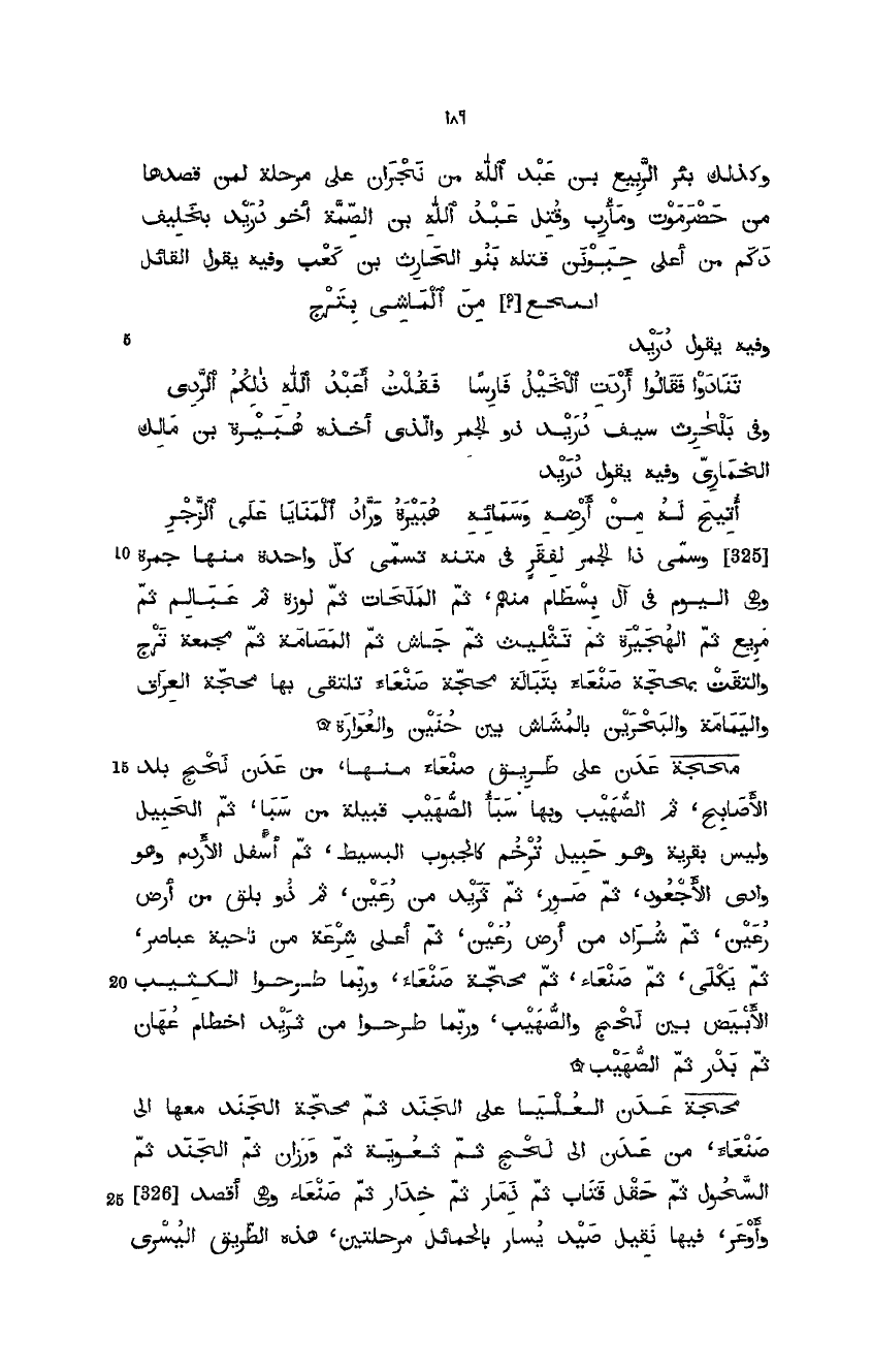 محجة عدن على طريق صنعاء منها، من عدن لحج بلد الأصابح، ثم الصهيب وبها سبأ الصهيب قبيلة من سبأ، ثم الحبيل وليس بقرية وهو حبيل تزخم كالحبوب البسيط، ثم أسفل الأردم وهو وادي الأجعود، ثم صور، ثم ثريد من رعين، ثم ذو بلق من أرض رعين، ثم شراد من أرض رعين، ثم أعلى شرعة من ناحية عباصر، ثم يكلى، ثم صنعاء، ثم محجة صنعاء، وربما طرحوا الكثيب البيض بين لحج والصهيب، وربما طرحوا من ثريد أخطام عهان ثم بدر ثم الصهيب.