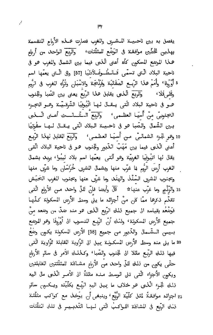 يفصل به بين المشرق والمغرب فصارت هذه الأرباع المنقسمة بهذين الخطين موافقة في الوضع للمثلثات، والربع الواحد من أرباع هذا الموضع المسكون كله - أعني الذي فيما بين الشمال والمغرب - هو في ناحية البلاد التي تسمى قالطوغالاطيا وهي التي يعمها اسم أوروفا، وأمم هذا الربع الصقالبة وفرنجة والإسبان وترك المغرب في الروم وقالي قلا. والربع الذي يقابل هذا الربع - يعني بين الصبا والجنوب - هو في ناحية البلاد التي يقال لها إتيوفيا الشرقية وهي الجزء الجنوبي من آسيا العظمى، والربع الثالث اعني الذي بين الشمال والصبا هو في ناحية البلاد التي يقال لها سقوتيا وهو الجزء الشمالي من أسيا العظمى، والربع المقابل لهذا الربع أعني الذي فيما بين مهبِّ الدبور والجنوب هو في ناحية البلاد التي يقال لها إتيوفيا الغربية وهي التي يعمها اسم بلاد ليبوا، يريد بشمال المغرب أرض الروم فما غرب منها وبشمال المشرق خراسان وما شرق منها وبجنوب المشرق السند والهند وما شرق عنها وبجنوب المغرب الحبش والزنج وما غرب عنها. قال أيضاً فإن لكل واحد من الأرباع التي تقدم ذكرها مما كان من أجزائه ما يلي وسط الأرض المسكونة، كلها فوضعه بقياسه إلى جميع ذلك الربع الذي هو منه ضد وضعه من جميع الأرض المسكونة، وذلك أن الربع المنسوب إلى أوروفا وهو الموضع بين الشمال والدبور من جميع الأرض المسكونة يكون وضع ما يلي منه وسط الأرض المسكونة يميل إلى الزاوية المقابلة للزاوية التي فيها ذلك الربع مائلاً إلى الجنوب والصّبا، وكذلك الأمر في سائر الأرض حتى يكون من ذلك لكل واحد من الأرباع مشاكل للمثلثتين المقابلتين وتكون الأجزاء التي تلي الوسط منه مائلة إلى الأمر الذي مال إليه ذلك الجزء الذي هو خلاف ما يميل إليه بكليته ويكون سائر أجزائه موافقة لمثل كلية الربع، وينبغي أن يؤخذ مع كواكب مثلثة ذلك الربع في المشاكلة الكواكب التي لها التدبير في تلك المثلثات