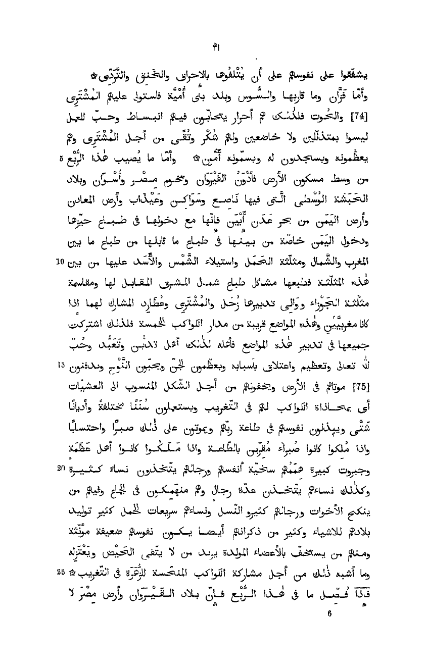 يشفقوا على نفوسهم على أن يتلفوها بالإحراق والخنق والتردي. وأما فزّان وما قاربها والسوس وبلد بني أمية فاستولى عليهم المشتري والحوت فلذلك هم أحرار، يتحابون فيهم انبساط وحب للعمل، ليسوا بمتذللين ولا خاضعين، ولهم شكر وتقى من أجل المشتري وهم يعظمونه ويسجدون له ويسمونه أمون وأما ما يصيب هذا الربع من وسط مسكون الأرض فأدون القيروان وتخوم مصر وأسوان وبلاد الحبشة الوسطى التي فيها باضع وسواكن وعيذاب وأرض المعادن وأرض اليمن من بحر عدن أبين فإنها مع دخولها في طباع حيزها ودخول اليمن خاصة من بينها في طباع ماقبلها من طباع ما بين المغرب والشمال ومثلثة الحمل، واستيلاء الشمس والأسد عليها من بين هذه المثلثة فطبعها مشاكل طباع شمال المشرق المقابل لها، ومقاسمة مثلثة الجوزاء ووالي تدبيرها زحل، والمشتري وعطارد المشارك لهما إذا كانا مغربيين، وهذه المواضع قريبة من مدار الكواكب الخمسة فلذلك اشتركت جميعها في تدبير هذه المواضع، وأهله لذلك أهل تدين وتعبد وحب الله تعالى وتعظيم، وإعلاق بأسبابه، ويعظمون الجن ويحبون النوح، ويدفنون موتاهم في الأرض، ويخفونهم من أجل الشكل المنسوب إلى العشيات أي بمحاذاة الكواكب لهم في التغريب، ويستعملون سنناً مختلفة وأدياناً شتى، ويبذلون نفوسهم في طاعة ربهم ويموتون على ذلك صبراً واحتساباً، وإذا ملكوا كانوا صبراء مقرين بالطاعة، وإذا ملكوا كانوا أهل عظمة وجبروت كبيرة هممهم سخية أنفسهم ورجالهم يتخذون نساء كثيرة وكذلك نساؤهم يتخذن عدة رجال وهم منهمكون في الجماع، وفيهم من ينكح الأخوات، ورجالهم كثيرو النسل ونساؤهم سريعات الحمل، كثير توليد بلادهم للأشياء، وكثير من ذكرانهم أيضاً تكون نفوسهم ضعيفة مؤنثة ومنهم من يستخف بالأعضاء المولدة يريد من لا يتقي الحيض ويعتزله وما أشبه ذلك من أجل مشاركة الكواكب المنحسة للزهرة في التغريب. فإذا فصل ما في الربع فإن بلاد القيروان وأرض مصر لا