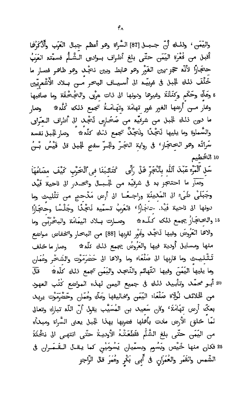 وصار ما احتجز به في شرقيه من الجبال وانحدر إلى ناحية فيد وجبلي طيّءٍ إلى المدينة وراجعاً إلى أرض مذحج من تثليث وما دونها إلى ناحية فيد، حجاز، فالعرب تسميه نجداً وجلساً وحجازاً والحجاز يجمع ذلك كله. وصارت بلاد اليمامة والبحرين وما والاها العروض وفيها نجد وغور لقربها من البحار وانخفاض مواضع منها، ومسايل أودية فيها والعروض يجمع ذلك كله. وصار ما خلف تثليث وما قاربها إلى صنعاء وما والاها إلى حضرموت والشِّحر وعُمان وما يليها اليمن، وفيها التهائم والنجد واليمن تجمع ذلك كله. قال أبو محمد: وتأييد ذلك في جميع اليمن لهذه المواضع كتب العهود من الخلائف لولاة صنعاء اليمن ومخاليفها وعكّ وعُمان وحضرموت يريد بعك أرض تهامة، وكان سعيد بن المسّيب يقول: إن الله تبارك وتعالى لما خلق الأرض مادت بأهلها، فضربها بهذا الجبل، يعني السراة، ومبدؤه من اليمن حتى بلغ الشام فقطعته الأودية حتى انتهى إلى نخلة فكان منها حيص ويسوم ويسميان يسومين، كما يقال القمران في الشمس والقمر والعمران في أبي بكر وعمر قال الراجز: