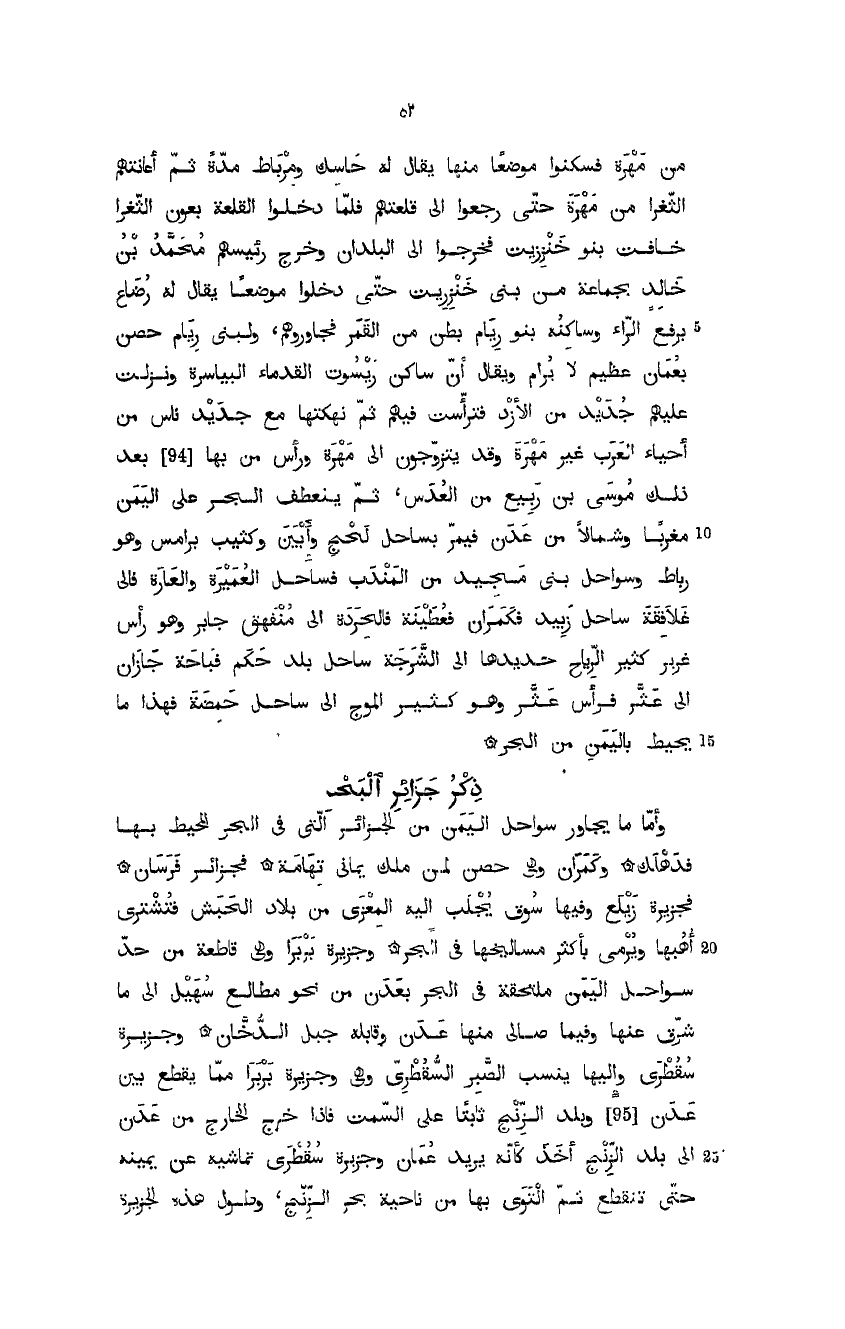 من مهرة فسكنوا موضعاً يقال له حاسك ومرباط مدة ثم أعانتهم الثّغرا من مهرة حتى رجعوا إلى قلعتهم، فلما دخلوا القلعة بعون الثّغرا خافت بنو خنزريت فخرجوا إلى البلدان وخرج رئيسهم محمد بن خالد بجماعة من بني خنزريت حتى دخلوا موضعاً يقال له رضاع برفع الراء وساكنه بنو ريام بطن من القمر فجاوروهم، ولبني ريام حصن بعُمان عظيم لا يرام، ويقال إن ساكن ريسوت القدماء البياسرة، ونزلت عليهم جديد من الأزد فترأست فيهم ثم نهكتها مع جديد ناس من أحياء العرب غير مهرة وقد يتزوجون إلى مهرة، ورأس من بها بعد ذلك موسى بن ربيع من العدس، ثم ينعطف البحر على اليمن مغرباً وشمالاً من عدن فيمر بساحل لحجٍ وأبين وكثيب يرامس وهو رباط وسواحل بني مجيد من المندب فساحل العميرة فالعارة فإلى غلافقة ساحل زبيد فكمران فعطينة فالحردة إلى منفهق جابر وهو رأس غزير كثير الرياح حديدها، إلى الشَّرجة ساحل بلد حكم فباحة جازان إلى عثَّر فرأس عثَّر، وهو كثير الموج إلى ساحل حمضة، فهذا ما يحيط باليمن من البحر.