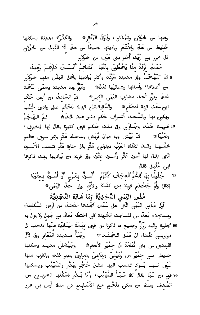 وفيها من خولان وهمدان، وذوال المعقر. والكدراء مدينة يسكنها خليط من عك والأشعر وباديتها جميعاً من عك إلا النبذ من خولان قال عمرو بن زيد أخو بني حي بن عوف من خولان:؟ مضت فرقة منا يحطوّن بالقنا فشاهر أمست دارهم وزبيد ثم المهجم وهي مدينة سردد وأكثر بواديها وأهل البأس منهم خولان من أعلاها وأسفلها وشماليها لعكّ. ومورٌ وبه مدينة تسمى بلحة لعكّ، ومور أحد مشارب اليمن الكبار. ثم الساعد من أرض حكم بن سعد قرية لحكم. والسقيفتان قرية لحكم على وادي خلب ويكون بها وبالسَّاعد أشراف حكم بنو عبد الجد. ثم الهجر قرية ضمد وجازان وفي بلد حكم قرى كثيرة يقال لها المخارف وصبيا. ثم بيش وبه موالي قريش، وساحله عثر وهو سوق عظيم شأنها وقد تثقله العرب فيقولون عثَّر وإلى حازة عثَّر تنسب الأسود التي يقال لها أسود عثر وأسود عتود. وهي قرية من بواديها وقد ذكرها ابن مقبل فقال: