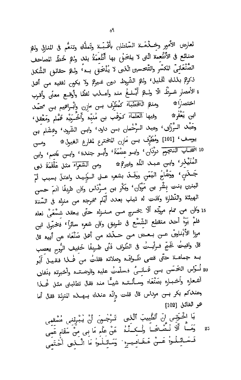 لعارض الأمور وخدمة السلطان بأهبة وتملك وتنعم في المنازل ولهم صنائع في الأطعمة التي لا يلحق بها أطعمة بلد، ولهم خط المصاحف الصنعاني المكسر والتحسين الذي لا يلحق بهم ولهم حقائق الشكل ذكرهم بذلك الخليل، ولهم الشروط دون غيرهم، ولا يكون لفقيه من أهل الأمصار شرط إلا ولهم أبلغ منه وأعذب لفظاً وأوقع معنى وأقرب اختصاراً. ومنهم الخطباء كمطرِّف بن مازن وإبراهيم بن محمد بن يعفر بضم الياء وكسر الفاء. وفيها العلماء كوهب بن منبه وأخويه هماَّم ومعقل؛ وعبد الرّزَّاق، وعبد الرحمن بن داود، وابن الشرود وهشام بن يوسف، ومطرِّف بن مازن المخترع لمفارع الغيول. ومن أصحاب النجوم: دردان، وابو عصمة، وأبو جندة، وابن عاصم، وابن المنيذر، وابن عبد الله وغيرهم. ومن الشعراء مثل علقمة ذي جدن، ووضَّاح اليمن ووفد بشعره على الوليد واغتيل بسبب أم البنين بنت بشر بن مروان، وبكر بن مرداس وكان ظريفاً آدم حسن الهيئة والنظارة وكانت له ثياب بعدد أيام مخرجه من منزله في السنة وكان من تمام مروءته ألاَّ يخرج من منزله حتى يعقد شسعي نعله فلم يره أحد منقطع الشسع في طريق، وكان شعره سائراً، فخبرني ابن مرزا الأبناوي عن بعض من حدثه من أهل صنعاء عن أبيه قال: وافيت الحج فرأيت في الطواف فتى ظريفاً خفيف الروح يعصب به جماعة حتى قضى طوافه وصلاته فقلت: من هذا؟ فقيل أبو نواس الحسن بن هاني فسلمت عليه وفاوضته وأخبرته بنفاق أشعاره وأخباره بصنعاء وسألته شيئاً منه فقال: تطلبني مثل هذا وعندكم بكر بن مرداس قال: قلت وإنه عندك بهذه المنزلة؟ فقال: اما هو القائل: