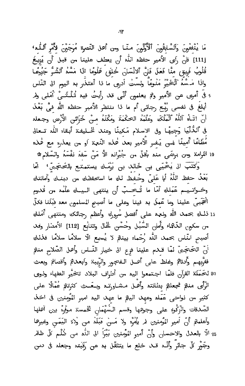 ما ينفقون، والسابقون الأولون منا ومن أهل النصرة مرجوون لأمر الله، فإن رأى الأمير حفظه الله أن يعطف علينا من قبل أن يزيغ قلوب فريق منا فعل فإن الإنسان خلق هلوعاً، إذا مسه الشر جزوعاً، وإذا مسه الخير منوعا، ولست أدري ماذا أعتذر به اليوم إلى الناس في أمري عن الأمير، وهم يعلمون أني قد رأيت فيه ثلثي أملي ولم ابلغ في نفسي ربع رجائي، أم ماذا ينتظر الأمير حفظه الله فيَّ بعد أن آتاه الله لملك، وعلمه الحكمة، ومكنه من خزائن الأرض وجعله في الدنيا وجيهاً، وفي الإسلام مكيناً، وعند الخليفة - أبقاه الله تعالى - مطاعاً أميناً، فمن يفر الأمير بعد هذه النعمة أو من يعذره مع هذه الكرامة، ومن يرضى منه بأقل من جبرانه إلا من سفه نفسه والسلام.