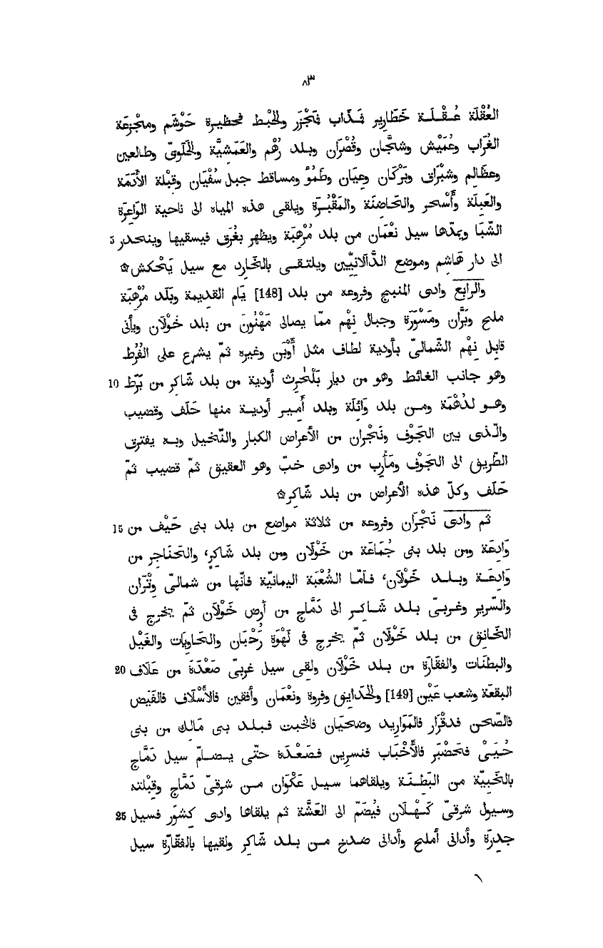 ثم وادي نجران وفروعه من ثلاثة مواضع من بلد بني حيف من وادعة ومن بلد بني جماعة من خولان ومن بلد شاكر، والحناجر من وادعةوبلد خولان فأما الشُّعبة اليمانية فإنها من شمالي وتران والسرير وغربي بلد شاكر إلى دمَّاج من أرض خولان ثم يخرج في الخانق من بلد خولان ثم يخرج في لهوة رحبان والحاوتان والغيل والبطنات والفقارة من بلد خولان ولقي سيل غربي صعدة من علاف البقعة وشعب عين والحدايق وفروة ونعمان وأفقين فالأسلاف فالفيض فالصحن فدقرار فالمواريد وضحيان فالخبت فبلد بني مالك من بني حيى فحضبر فالأخباب فنسرين فصعدة حتى يضامّ سيل دمَّاج بالخيبة من البطنة ويلقاهما سيل عكوان من شرقي دماج وقبلته، وسيول شرقي كهلان فيضمّ إلى العشة ثم يلقاها وادي كشور فسيل جدرة وأداني أملح وأداني ضدح من بلد شاكر ولقيها بالفقارة سيل