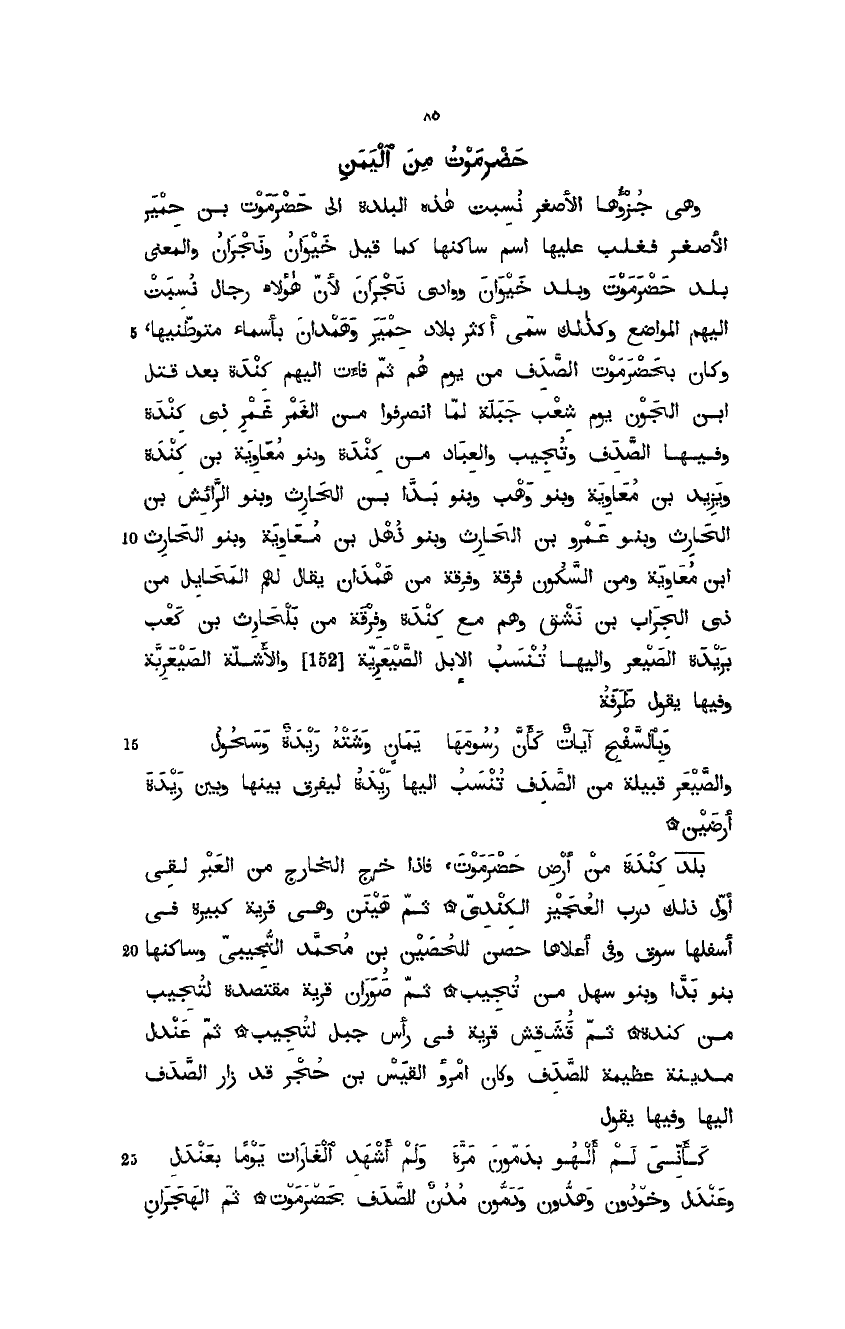 وهي جزؤها الأصغر نسبت هذه البلدة إلى حضرموت بن حمير الأصغر فغلب عليها اسم ساكنها كما قيل خيوان ونجران والمعنى بلد حضرموت وبلد خيوان ووادي نجران لأن هؤلاء رجال نسبت إليهم المواضع وكذلك سمي أكثر بلاد حمير وهمدان بأسماء متوطِّنيها، وكان بحضرموت الصَّدف من يوم هم، ثم فاءت إليهم كندة بعد قتل ابن الجون يوم شعب جبلة لما انصرفوا من الغمر غمر ذي كندة وفيها الصَّدف وتجيب والعباد من كندة وبنو معاوية بن كندة ويزيد بن معاوية وبنو وهب وبنو بدّا ابن الحارث وبنو الرايش بن الحارث وبنو عمرو بن الحارث وبنو ذهل بن معاوية وبنو الحارث ابن معاوية ومن السكَّون فرقة وفرقة من همدان يقال لهم المحاتل من ذي الجراب بن نشق وهم مع كندة وفرقة من بلحارث بن كعب بريدة الصيعر وإليها تنسب الإبل الصّيعرية وفيها يقول طرفة: