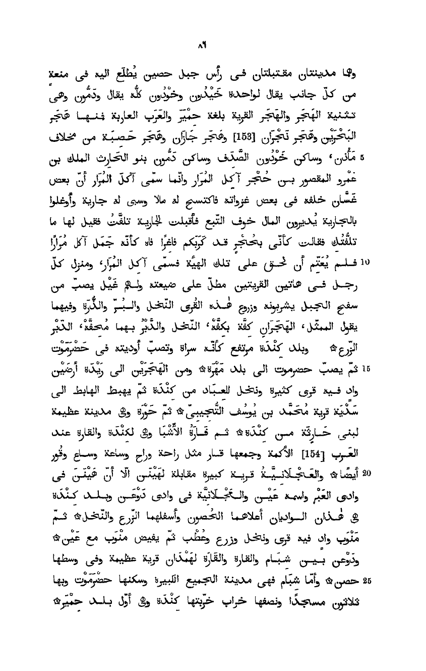 وهما مدينتان مقتبلتان في رأس جبل حصين يطلع إليه في منعة من كل جانب يقال لواحدة خيدون وخودون كلُّه يقال ودمُّون وهي تثنية الهجر والهجر القرية بلغة حمير والعرب العاربة فمنها هجر البحرين وهجر نجران وهجر جازان وهجر حصبة من مخلاف مأذن، وساكن خودون الصَّدف وساكن دمُّون بنو الحارث الملك ابن عمرو المقصور بن حجر آكل المرار وإنما سمحي آكل المرار أن بعض غسَّان خالفه في بعض غزواته فاكتسح له مالاً وسبى له جارية وأوغلوا بالجارية يديرون المال خوفف التّبع فأقبلت الجارية تلفَّت فقيل لها ما تلفتك؟ فقالت: كاني بحجر قد كربكم فاغراً فاه كأنه جمل أكل مراراً فلم يعتم أن لحق على تلك الهيئة فسمي آكل المرار، ومنزل كل رجل في هاتين القريتين مطل على ضيعته ولهم غيل يصبّ من سفح الجبل يشربونه وزروع هذه القرى النخل والعبر بها محفَّة. الذَّبر الزرع. من الهجران كفَّة بكفَّه، النّخل والذَّبر بهما محفَّه. الذَّبر الزرع. وبلد كندة مرتفع كأنه سراة وتصب في أوديته في حضرموت ثم يصب حضرموت إلى بلد مهرة من الهجرين إلى ريدة أرضين وادٍ فيه قرى كثيرة ونخل للعباد من كندة ثم يهبط الهابط إلى سدبة قرية محمد بن يوسف التُّجبيبي ثم حورة وهي مدينة عظيمة لبني حارثة من كندة ثم قارة الأشبا وهي لكندة، والقارة عند العرب الأكمة وجمعها قار مثل راحة وراح وساعة وساع وقور أيضاً - والعجلانية قرية كبيرة مقابلة لهينن إلا أن هينن في وادي العبر واسمه عين والعجلانية في وادي دوعن وبلد كندة هي هذان الواديان أعلاهما الحصون وأسفلهما الزروع والنخل. ثم منسوب وادٍ فيه قرى ونخل وزرع وعطب، ثم يفيض منوب مع عين ودوعن بين شبام والقارة، والقارة لهمدان قرية عظيمة في وسطها حصن. وأما شبام فهي مدينة الجميع الكبيرة وسكنها حضرموت وبها ثلاثون مسجداً ونصفها خراب خربتها كندة وهي أول بلد حمير.