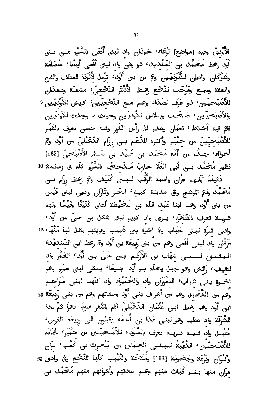 دثينة أولها عرَّان واسمه الرُّقب لبني كتيف وهم رهط رزام بن محمد ولهم الموشح وهي مدينة كبيرة الحار، وتاران واديان لبني قيس من بني أود وهما ابنا عبد الله بن سحيطة أعني كتيفا وقيسا ولهم قرية تعرف بالظاهرة، يرى واد كبير لبني شكل بن حي من اود، وادي ثرة لبني حباب وهم أخوة بني شبيب وقريتهم يقال لها منهى، عرفان وادٍ لبني أفعى وهم من بني ربيعة بن اود وهم رهط ابن الصِّنديد، المقيق لبني شهاب بن الأرقم بن حيّ بن أود، الغمر وادٍ لثقيف رائش وهو جبلٍ يحله بنو أود جميعاً، يسقى لبني عمرو وهم إخوة بني شهاب، المعوران وادٍ والحميراء وادٍكلهما لبني مزاحم وهم من الدَّهابل وهم من أشراف بني أود وسادتهم وهم من بني ربيعة بن أود وهم رهط ابن عثمان الدَّهبلي أقام بالثغر غازياً دهراً ثم عاد، الشَّرفة وادٍ عظيموهو لبني عدا بن أسامة يقولون إلى ربيعة الفرس، حبل وادٍ فيه قرية تعرف بالسَّوداء للأصبحييِّن من حمير، الحافة للأصبحييِّن، الدَّبيَّة لبني الحماس من بلحارث بن كعب، مران وكبران ونزعة وحجومة وملاحة والتَّيبب كلها للنخع، وفي واديمران منها بنو قباث منهم وه سادتهم وأشرافهم منهم محمد بن