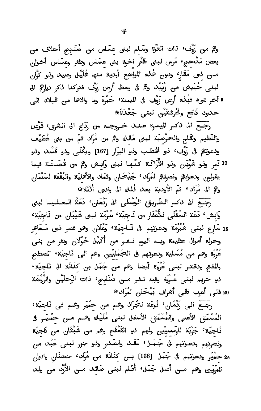 وهم من زوف، ذات القوة وسلم لبني عساس من صنابح أحلاف من بعض مذحج، مرس لبني ظفر إخوة بني عساس وظفر وعساس إخوان من ذي مقارٍ، ودون هذه المواصع أودية منها هليل وصيد وذو كزَّان لبني حبيش من زبيد وهم في وسط أرض زوف فتركنا ذكر ديارهم إلى آخر شيء، فهذه أرض زوف في الميمنة، حمرة وما والاها من البلاد إلى حدود يافع والجربتين لبني جعدة.