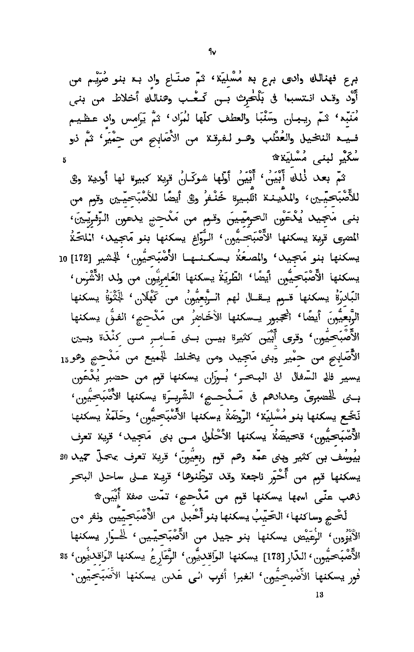ثم بعد ذلك أبين: بين أولها شوكان قرية كبيرة لها أودية وهي للأصبحييِّن، والمدينة الكبيرة خنفر وهي أيضاً للأصبحيين وقوم من بني مجيد يدعون الحرمييِن وقوم من مذحج يدعون الزّفرّيين، المضري قرية يسكنها الأصبحيُّون، الرواع يسكنها بنو مجيد، الملحة يسكنها بنو مجيد، والمصنعة يسكنها الأصبحيون، الجشير يسكنها الأصبحيُّون أيضاً، الطَّريَّة يسكنها العامريون من ولد الأشرس، الباردة يسكنها قوم يقال لهم الرَّبيعيُّون من كهلان، الجثوة يسكنها الرَّبعيُّون أيضاً، الحجبور يسكنها الأخاضر من مذحج، الفقُّ يسكنها الأصبحيون، وقرى أبين كثيرة بين بني عامر من كندة وبين الأصابح من حمير وبني مجيد ومن يخلط الجميع من مذحج وهو يسير، فإلى السفال إلى البحر، بوزان يسكنها قوم من حضبر يدعون بني الحضبري وعدادهم في مذحج، الشريرة يسكنها الأصبحيُّون، نخع يسكنها بنو مسلية، الروضة يسكنا الأصبحيون، وحلمة يسكنها الأصبحيون، قحيضة يسكنها الأحلول من بني مجيد، قرية تعرف بيوسف بن كثير وبني عمه وهم قوم ربعيون، قرية تعرف بمحل حميد يسكنها قوم من أحور ناجعة وقد توطنوها، قرية على ساحل البحر ذهب عني اسمها يسكنها قوم من مذحج، تمت صفة أبين.