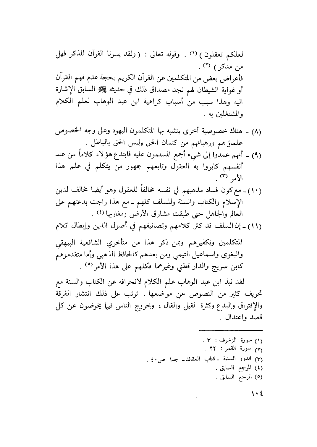 فأعراض بعض من المتكلمين عن القرآن الكريم بحجة عدم فهم القرآن أو غواية الشيطان لهم نجد مصداق ذلك في حديثه صلى الله عليه وسلم السابق الإشارة إليه وهذا سبب من أسباب كراهية ابن عبد الوهاب لعلم الكلام والمشتغلين به.